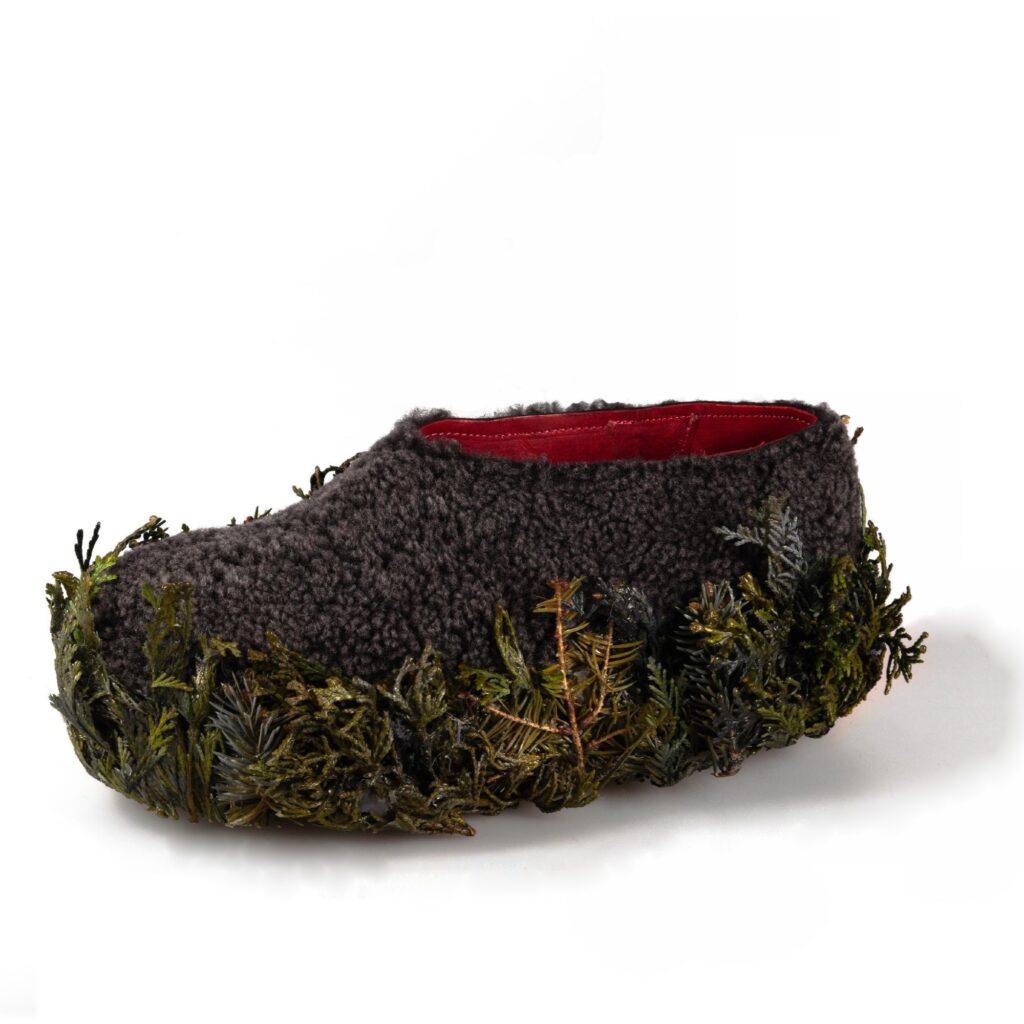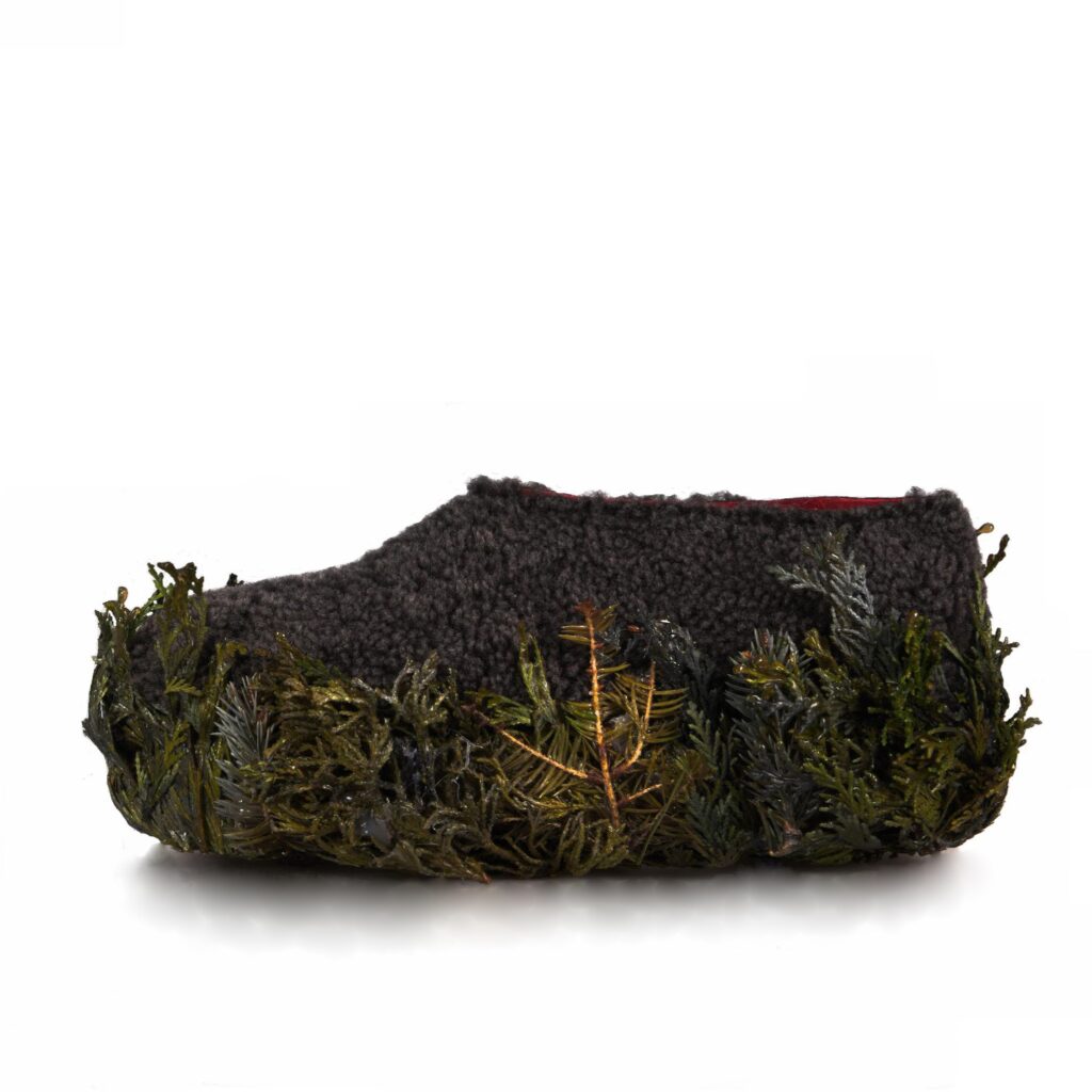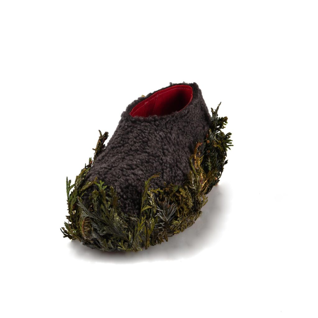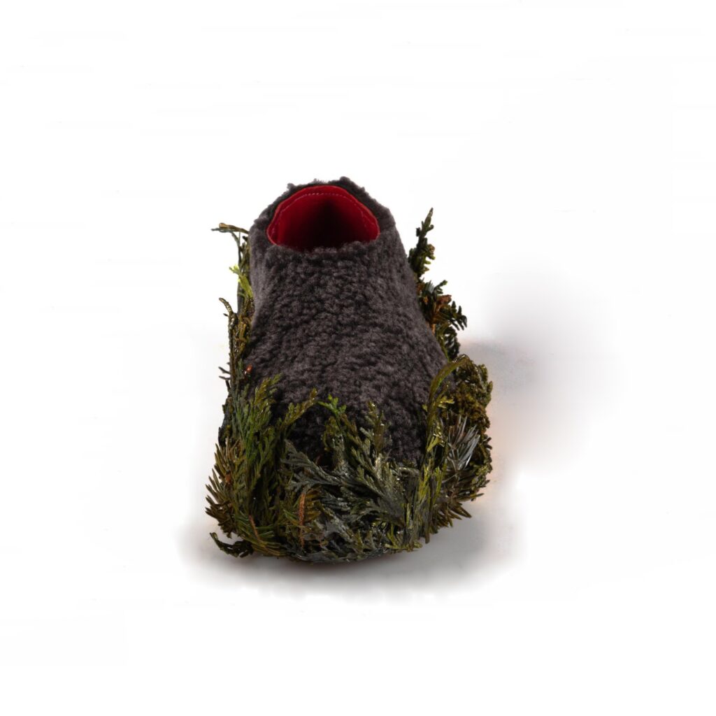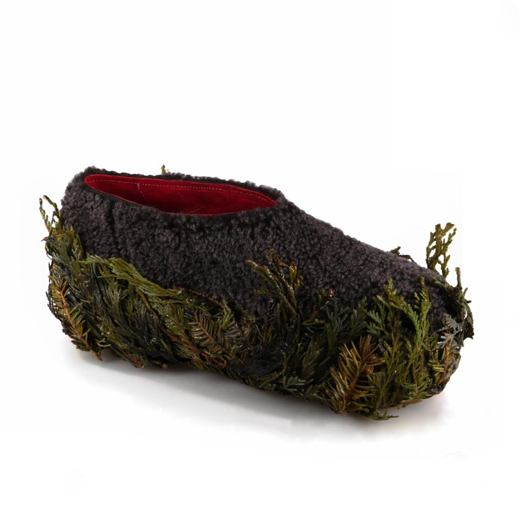 Balerínu jsem navrhl tak, aby svým vzhledem i použitými materiály zapadala do tohoto příběhu a odkazovala na jeho hlavní postavy. Podešev je tvořena větvičkami a jehličím z různých jehličnatých stromů, čímž připomíná les, ve kterém se děj odehrává. Svršek evokuje srst vlka a červená podšívka odkazuje na postavu Karkulky – symbolizuje její plášť, ale také motiv krve, který k příběhu neodmyslitelně patří