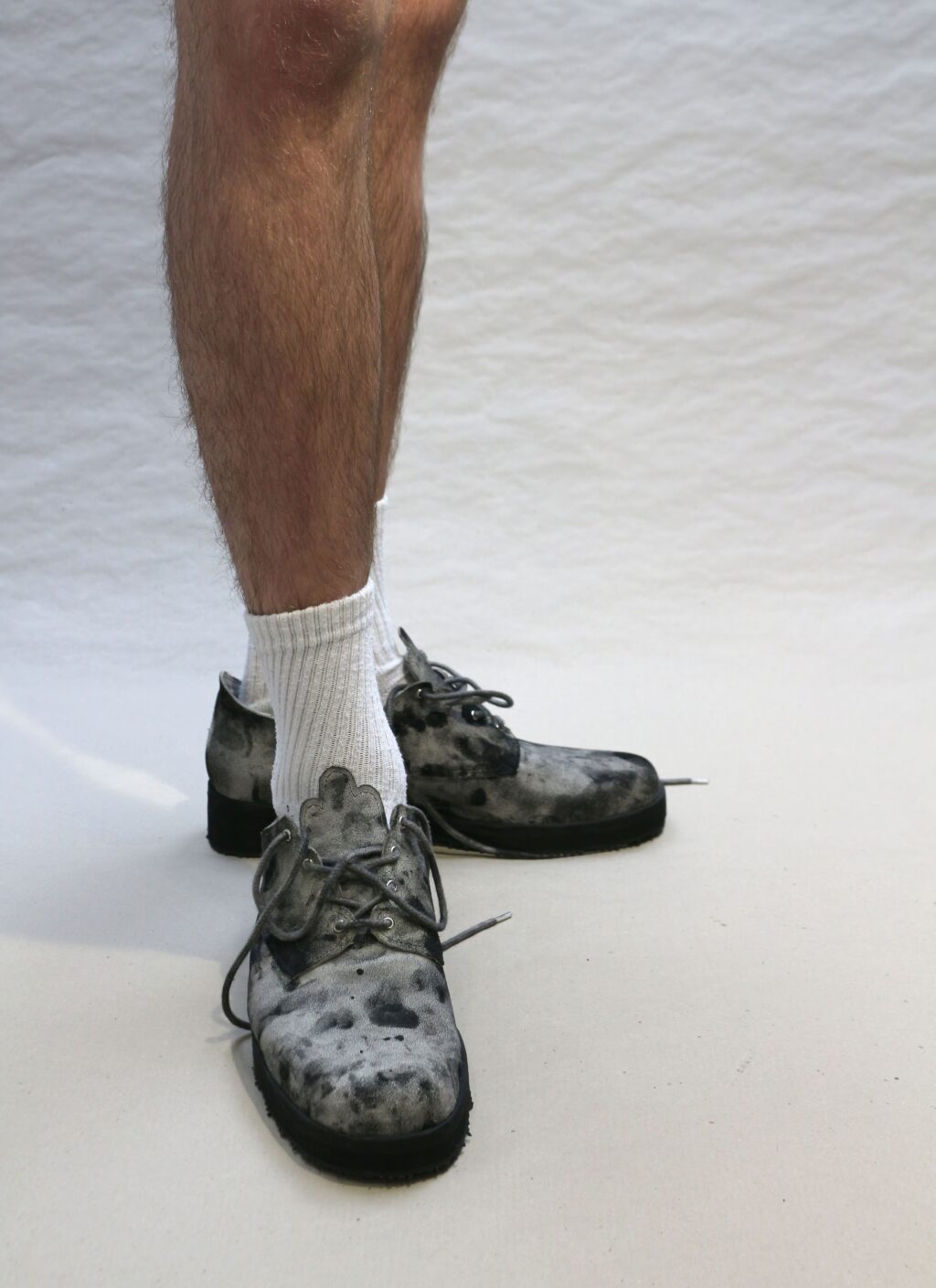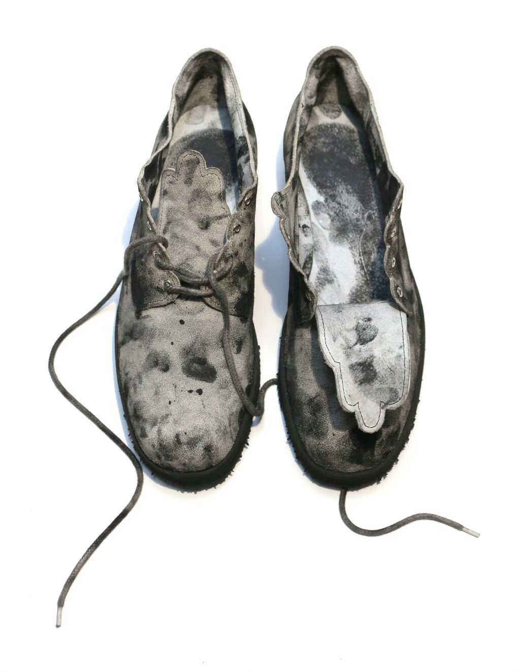 Tento pár bot vznikl jako výsledek spontánního a experimentálního přístupu k práci s materiálem. Při procesu vyřezávání jsem měl na rukou inkoust, který se nevědomky otiskl na povrch a vytvořil tak charakteristické černé šmouhy. Tyto náhodné stopy se staly součástí výsledného výrazu díla a podtrhly moment bezprostřednosti a fyzického kontaktu mezi tvůrcem a objektem.