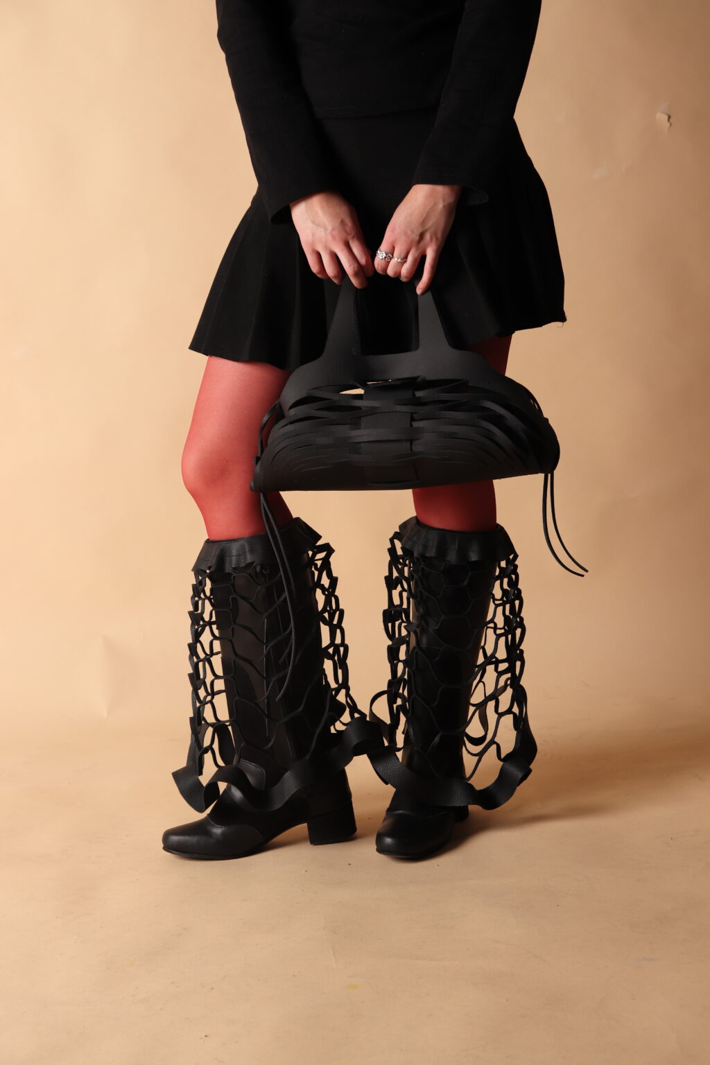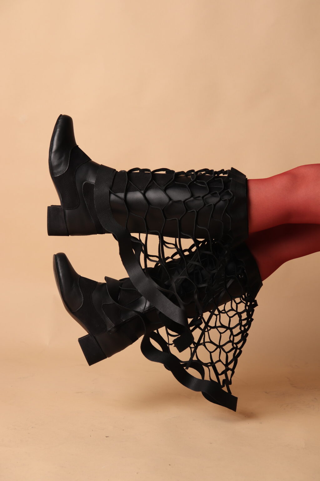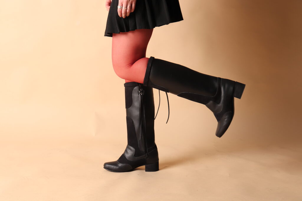 První část projektu tvoří kozačky s vysokou mírou estetické i funkční modifikace. Dominantním prvkem je odnímatelný lem, který svým výrazem hraničí s divadelní či taneční estetikou a dodává obuvi na pompéznosti. Po odstranění tohoto prvku se bota mění v minimalistický model vhodný pro běžné nošení. Konstrukce využívá luxusních materiálů, konkrétně leštěného hovězího crustu v kombinaci s nubukem a koženou podšívkou. Unikátním detailem je podpatek vyrobený z ořechového dřeva, které vyniká svou vysokou pevností, stabilitou a specifickou kresbou vláken, jež doplňuje přírodní charakter celého setu.
