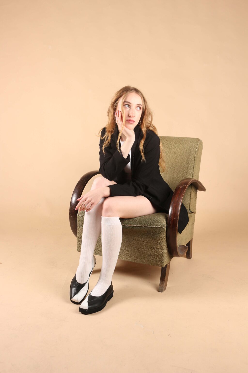 Tato práce představuje autorský design obuvi vytvořený na téma optické iluze. Hlavním tvůrčím záměrem bylo využití kontrastu černé a bílé usně k vizuálnímu klamu, který mění vnímání skutečného tvaru boty. Geometrické členění dílců způsobuje, že se bota jeví jako špičatá, přestože je konstruována na hranatém kopytě. Svršek z usně doplňuje odlehčená podešev z materiálu EVA, která podtrhuje minimalistický charakter modelu. Obuv byla navržena jako součást uceleného setu spolu s ladícím psaníčkem.