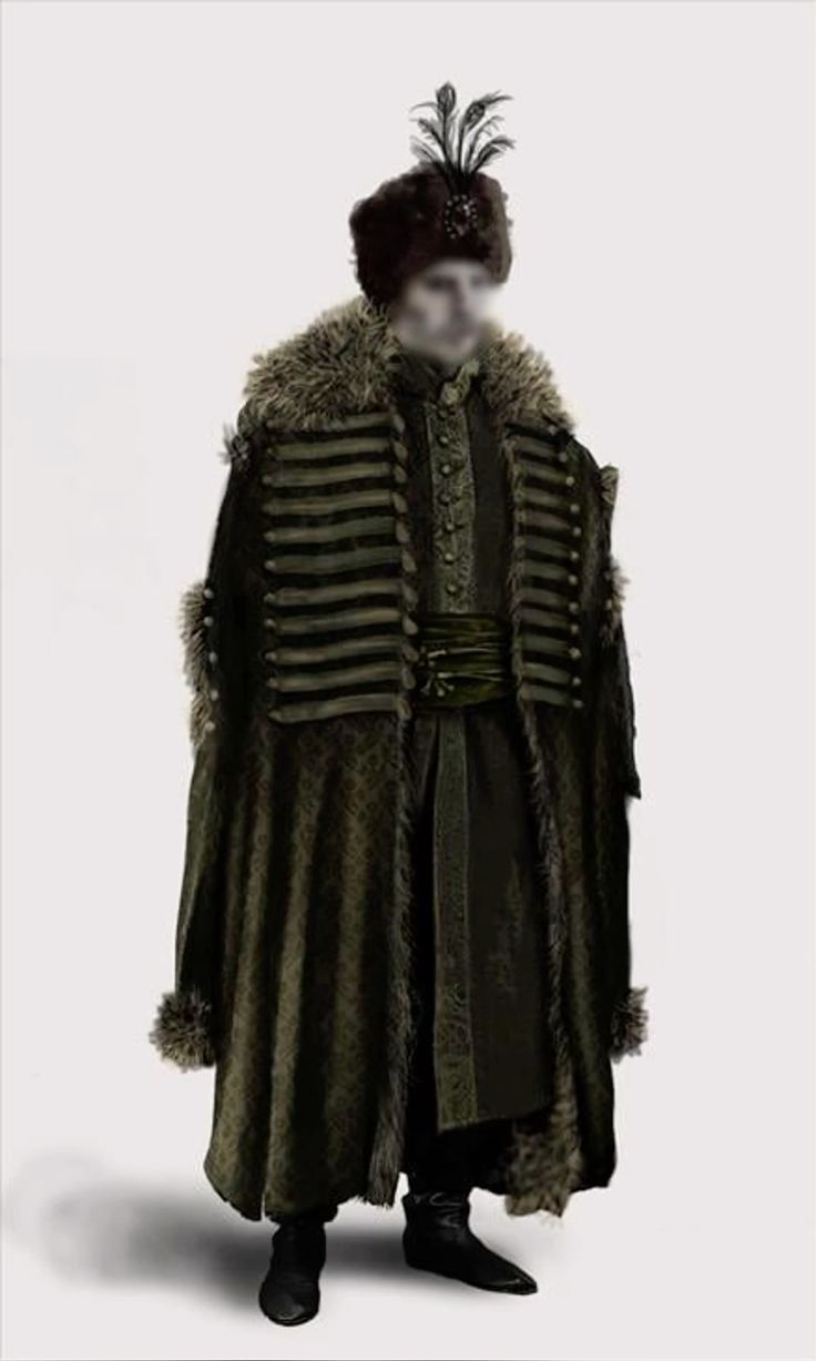 • nadrozměrný kožich se zapínáním typickým pro uherské vojenské uniformy z 2. poloviny 19. století