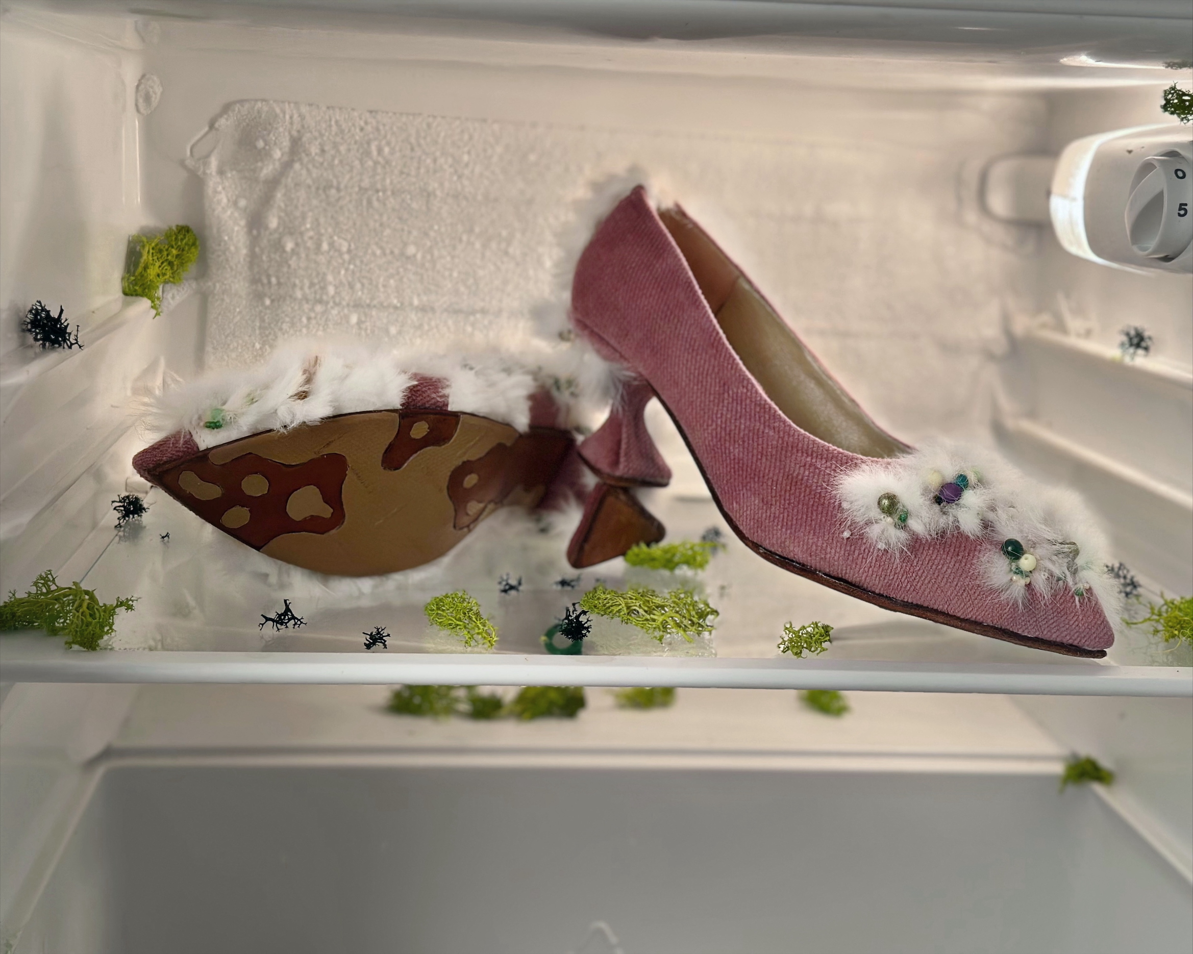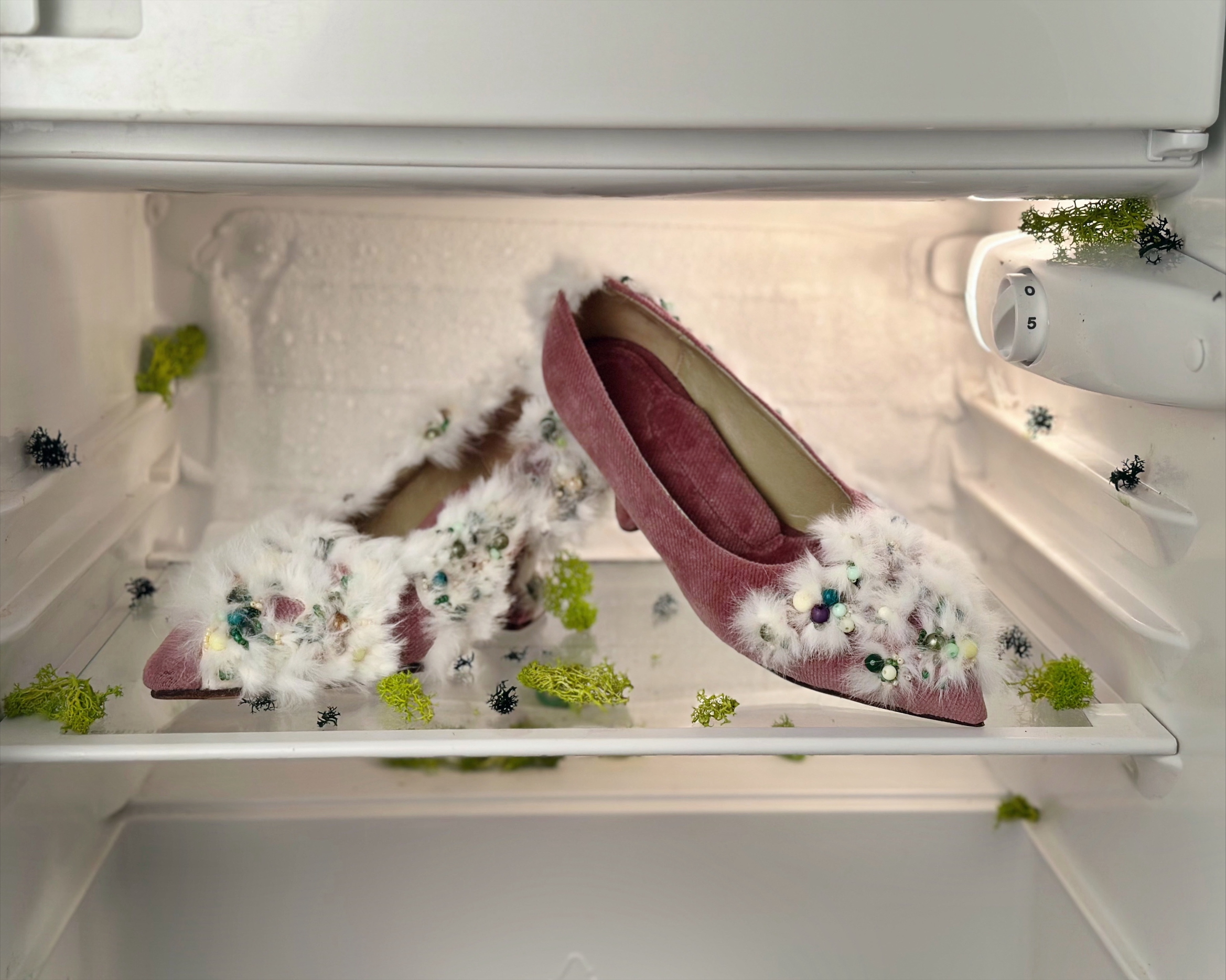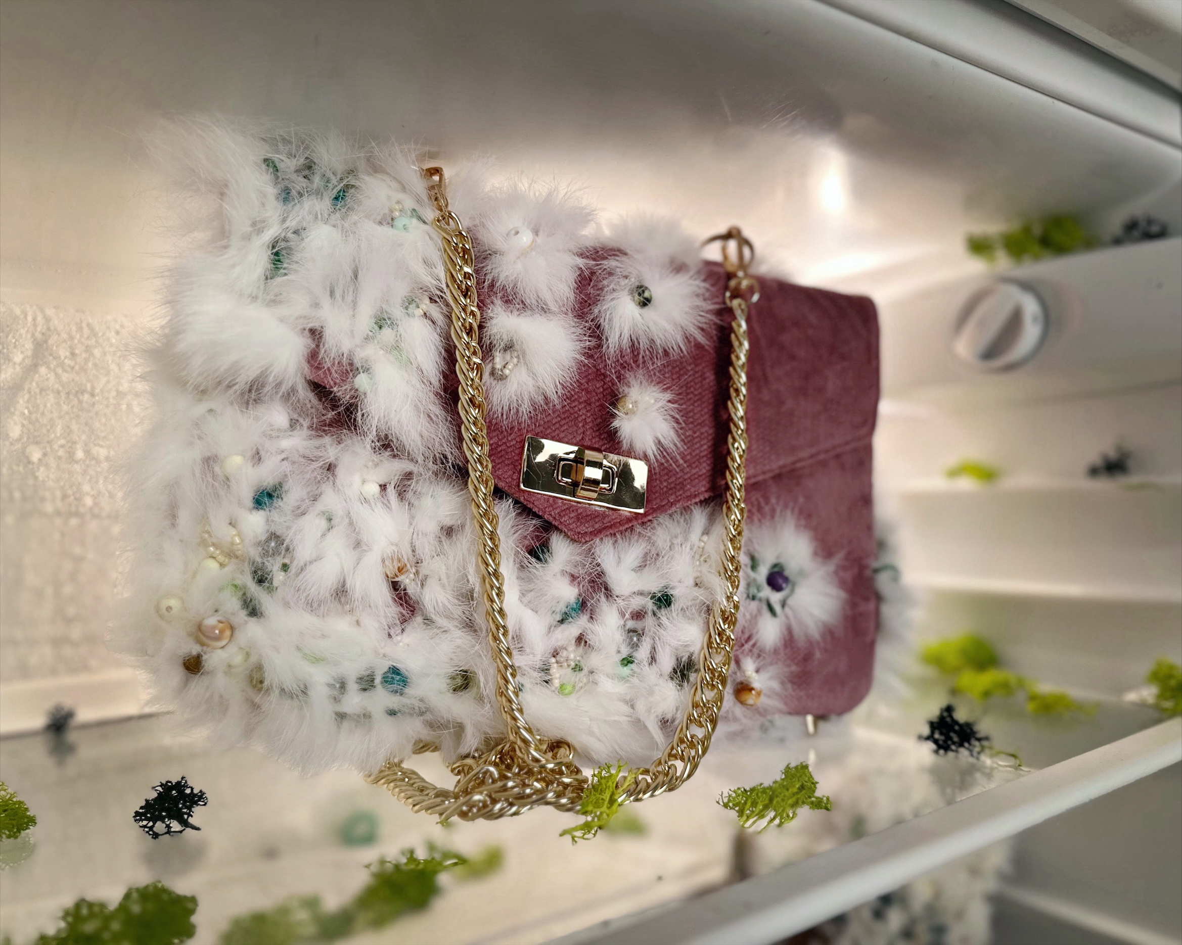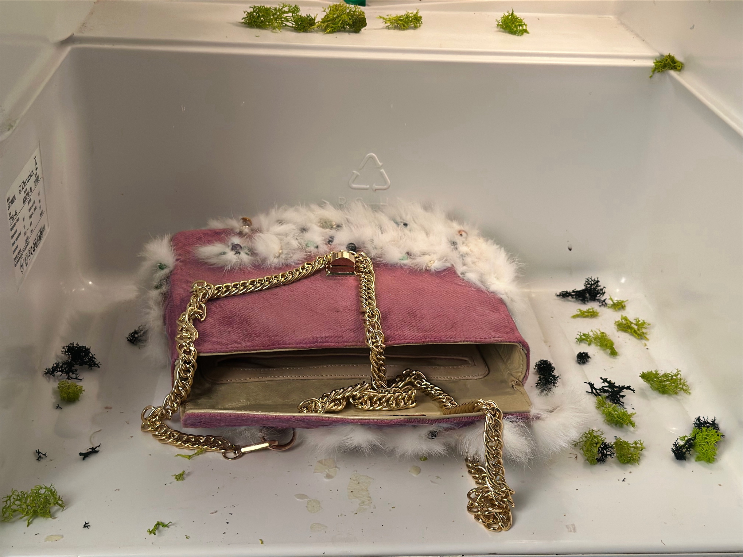 Sametový set lodiček a kabelky s králičí srstí vyšívaný stovkami korálků tvořící iluzi plesnivého pozlátka. Co se možná jeví jako prestižní a luxusní, lahodné na pohled je uvnitř toxické a prohnilé. V takovém chladném prostředí se až příliš často vyskytuji, trpím panickými záchvaty, výbuchy vzteku a pláče, jsem frustrovaná a unavená. Ale z každé plísně chci vyškrábat i ten poslední kousek toho krásného. Každou bolest si dobrovolně nechávám zmraženou uvnitř sebe a posouvám se dál. Vyčerpáním padám , ale i přes nemoce a nákazy přidávám ke každému chlupu další a další korálek do své mozaiky bolesti. Křičím o pomoc, ale jsem šťastná, miluju ten bující organismus.
