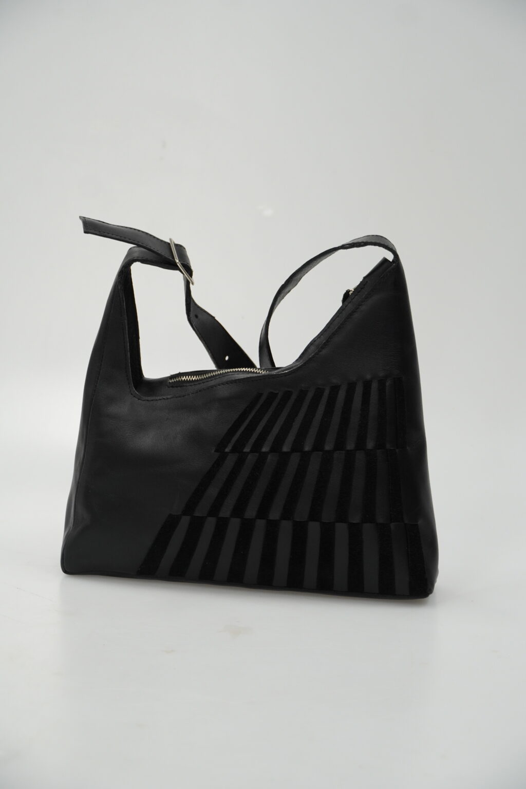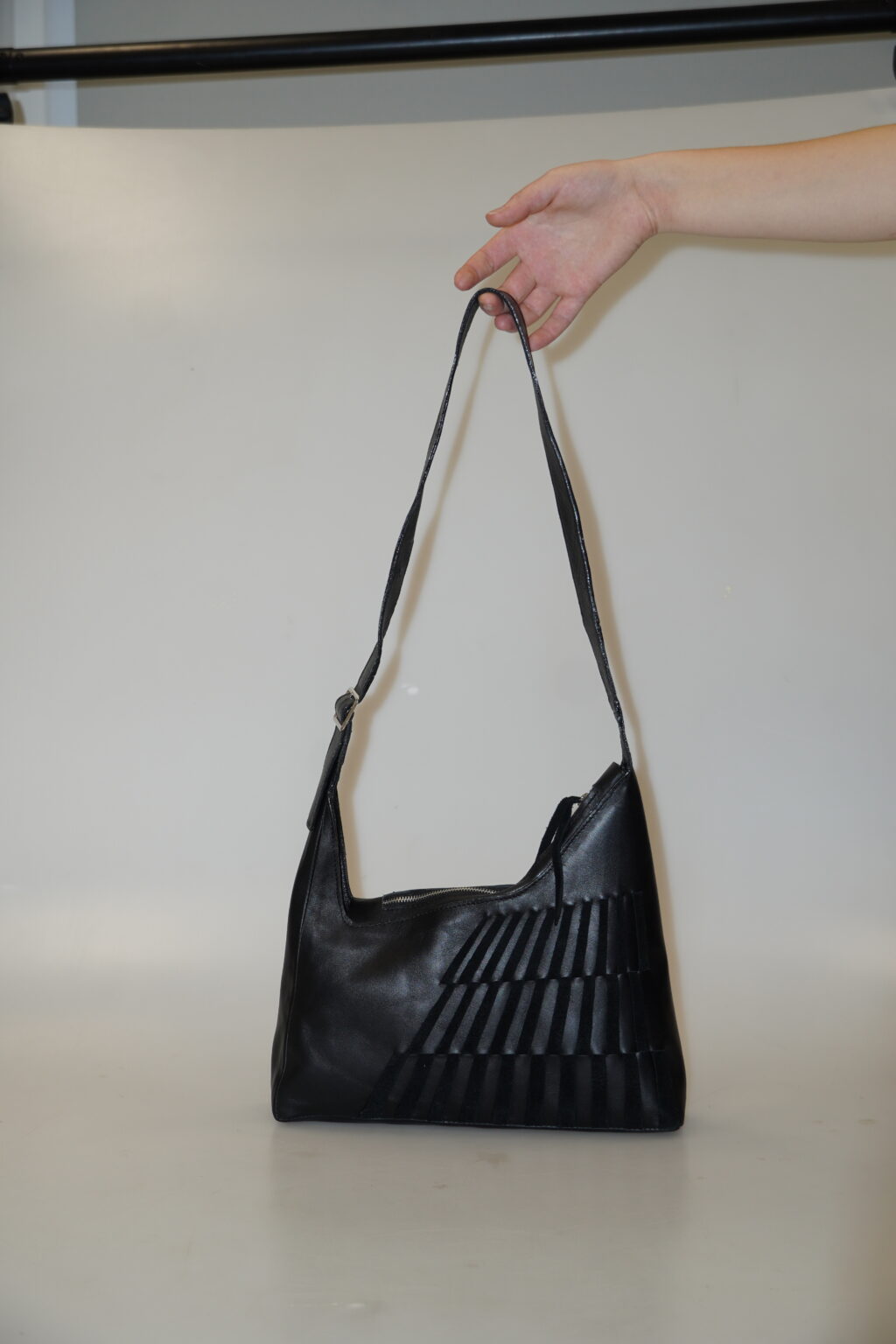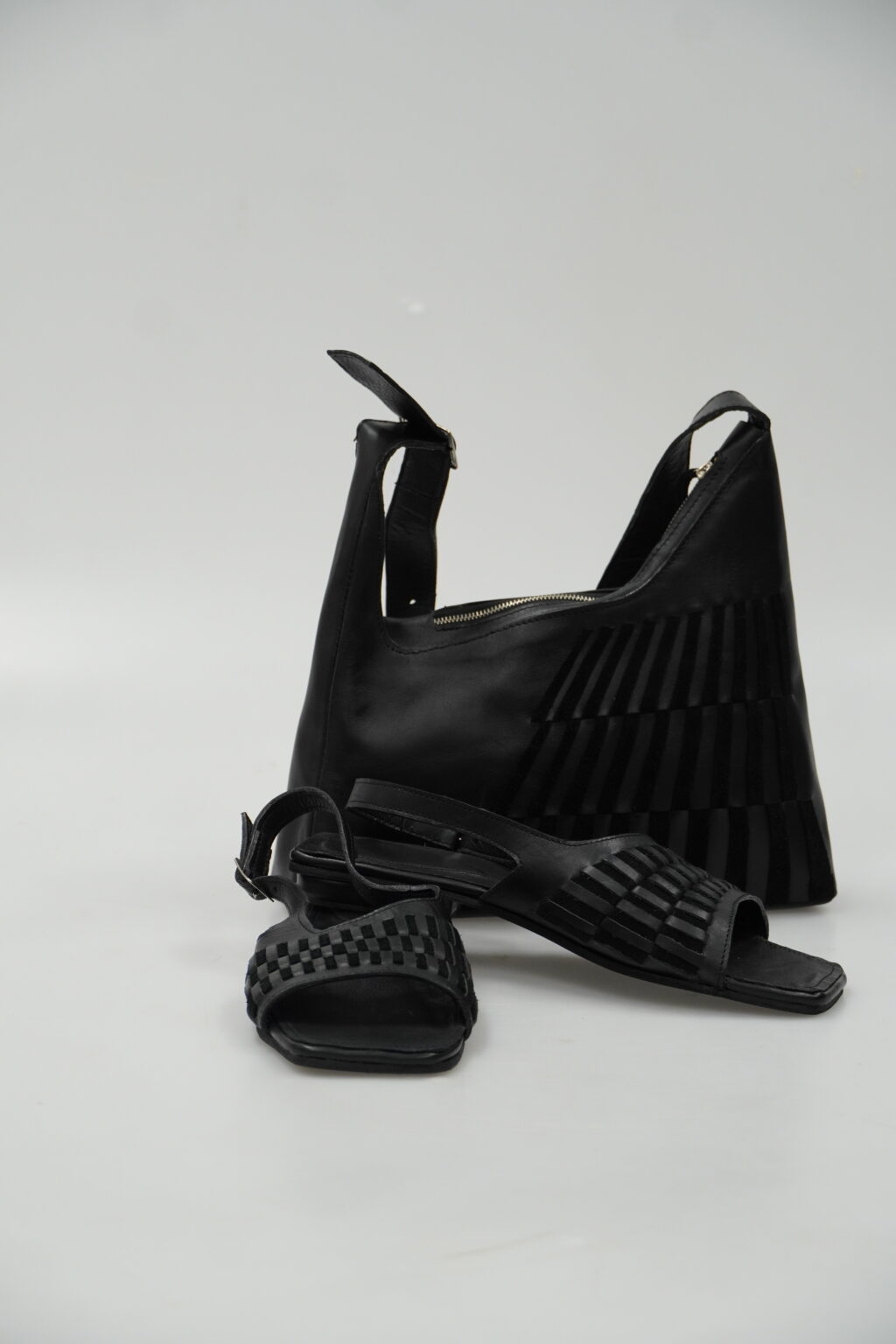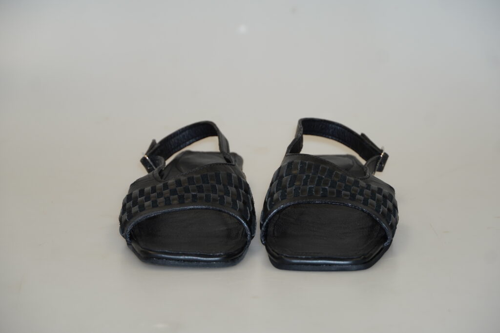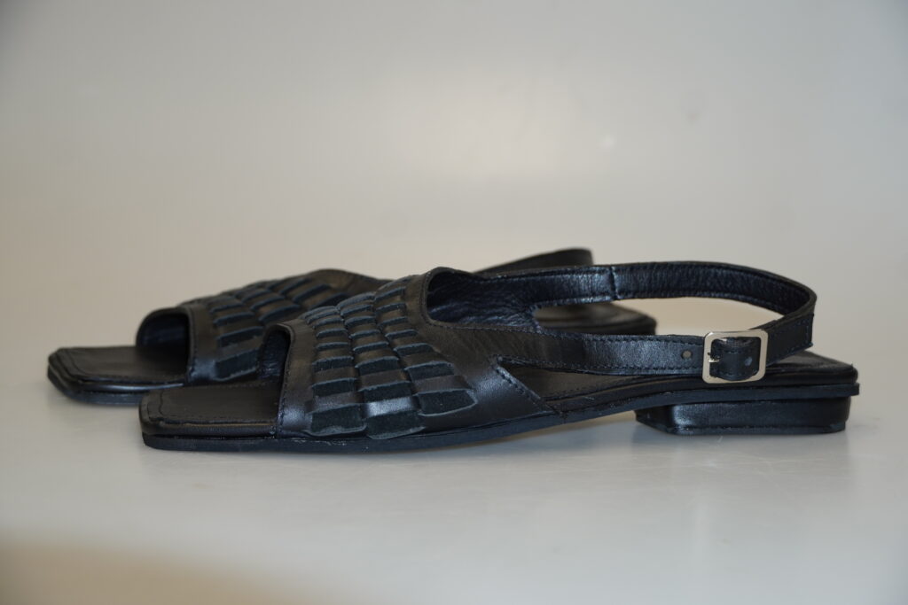 Zadání našich semestrálních prací bylo inspirovat se světovou obuvnickou značkou a ušít menší kabelku a sandály. Já jsem si vybrala Miistu, což je londýnská obuvní a oděvní značka, která produkuje převážně dámské produkty. Při navrhování jsem si vybrala jednotlivé páry obuvi a vizuálně i technologicky jsem je zkoumala. Nakonec jsem usoudila, že chci použít proplétání jednotlivých pruhů úsně mezi sebou, což jsem poté aplikovala na nártovou část sandálů a boční stranu kabelky. Chtěla jsem, aby působily jednolitě a minimalisticky, proto jsem si zvolila černou barvu. Jako materiál jsem vybrala dvě černé úsně, které se liší odstínem a strukturou, díky čemuž proplétání vynikne. Použila jsem tedy černou hovězinu a štípenku.