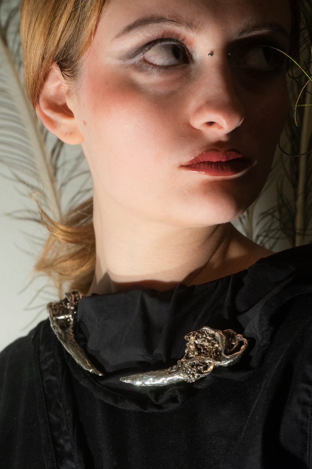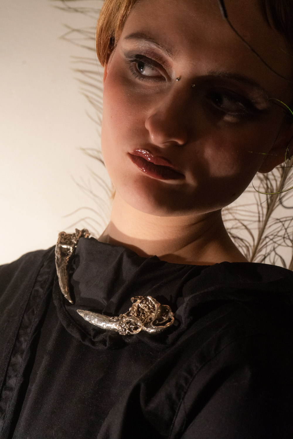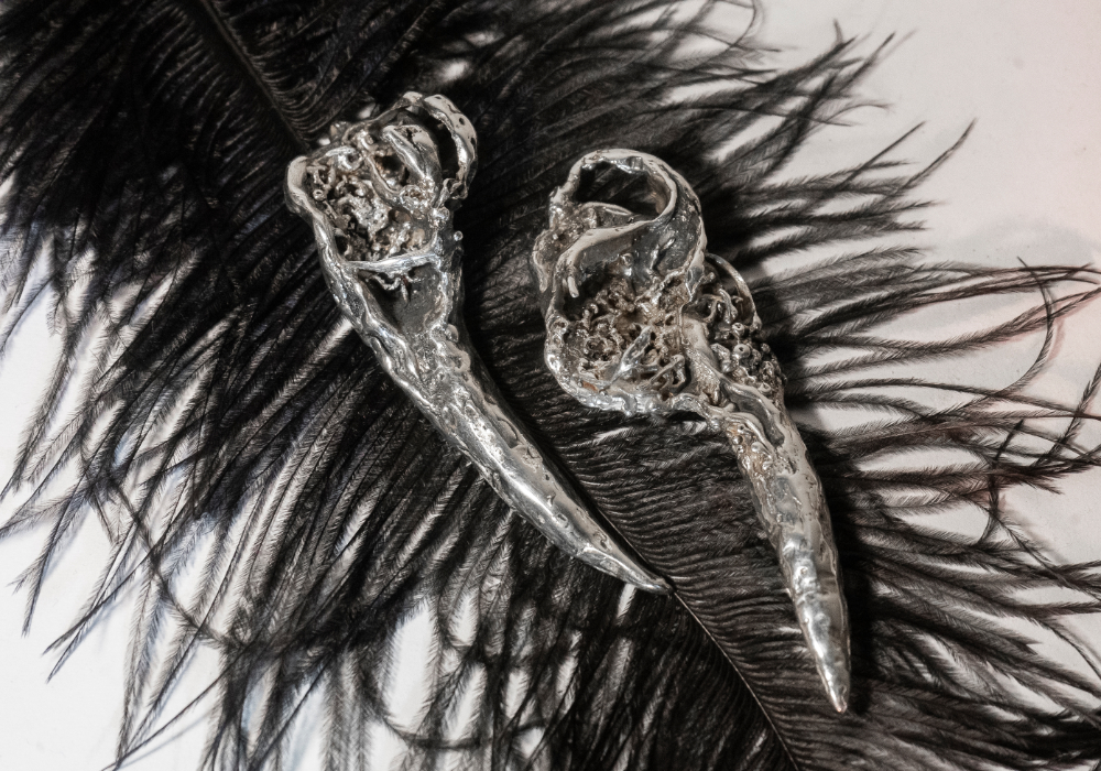 Dvojica brošní v tvare rohov na tému natura. Tvar rohov odkazuje na symboly ochrany, prirodzenosti a vnútornej sily. V antickom význame predstavuje Ægis ochranný štít – predmet, ktorý vytvára hranicu medzi vonkajším svetom a vnútorným priestorom nositeľa. Brošne rámujú oblasť kľúčnych kostí a formujú osobnú ochrannú zónu blízko tela. Od špičiek smerom k jadru sa hmota postupne zahusťuje a odhaľuje vnútorné štruktúry, do ktorých sú vsadené červené granáty. Tie symbolizujú vnútorné vrstvy a emócie nesúce stopu pamäte a času. Brošne spájajú silu, odolnosť a eleganciu a šperk je vnímaný ako ochranný objekt.