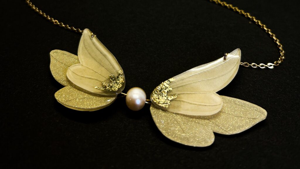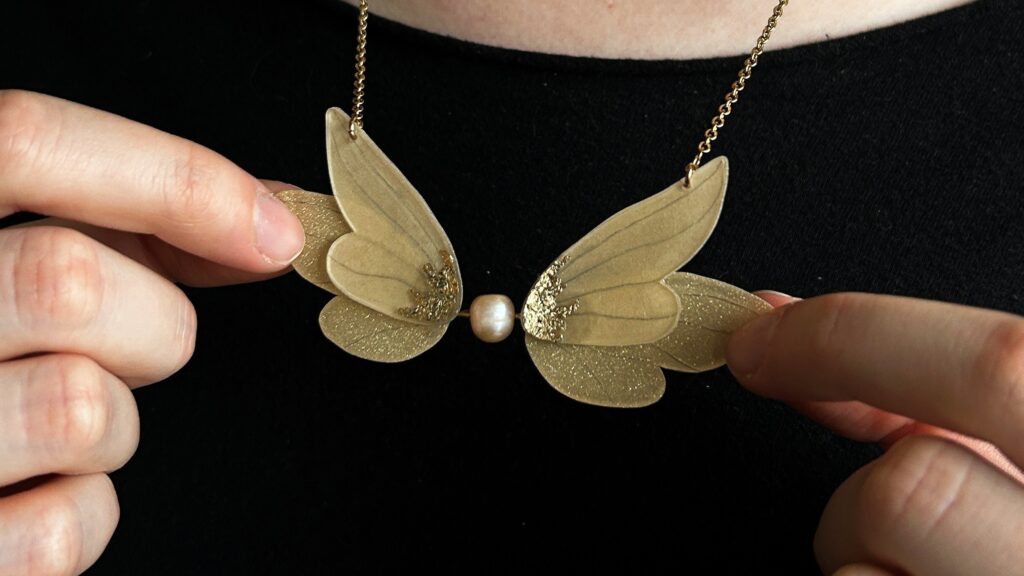 U náhrdelníku jsem se inspirovala secesním šperkařem Georgem Fouquetem a jeho typickou prací s lehkostí a symbolikou. Motiv křídel odkazuje na secesní fascinaci přírodními formami, pohybem a snem o vzletu. Zlatá barevnost navazuje na Fouquetovu estetiku luxusu a dekorativnosti. Křídla jsem vyrobila ze smršťovací fólie, která jim dodává lehkost a jemnost, a doplnila jsem je zlatými vločkami. Ústředním prvkem náhrdelníku je říční perla, která propojuje dekorativní secesní inspiraci s přirozenou krásou přírodního materiálu.