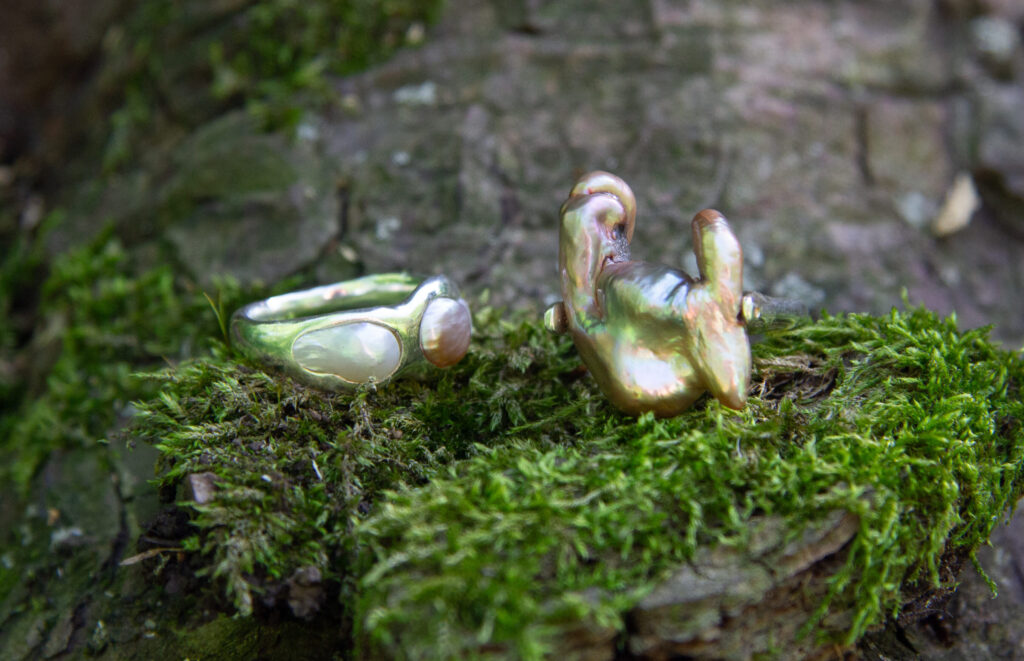 Sada stříbrných prstenů vyrobená technikou ztraceného vosku s říčními perlami.