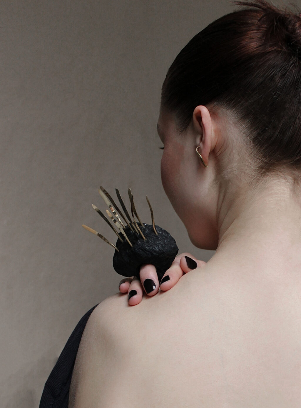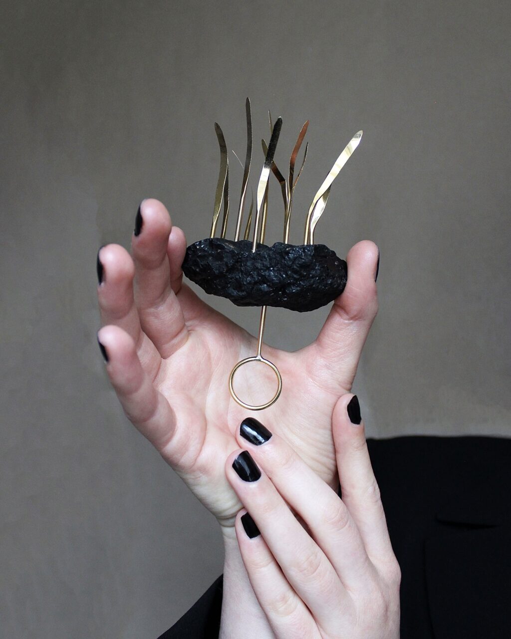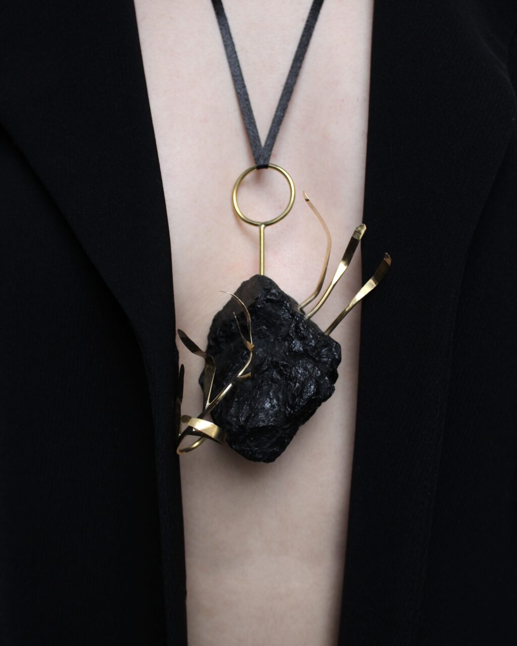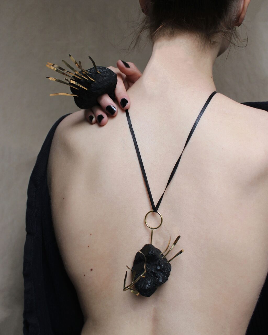 Šperky jsou vyrobeny z uhlí a mosazi.