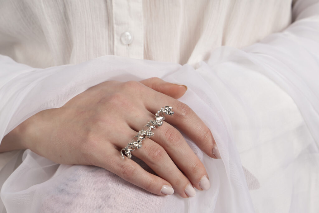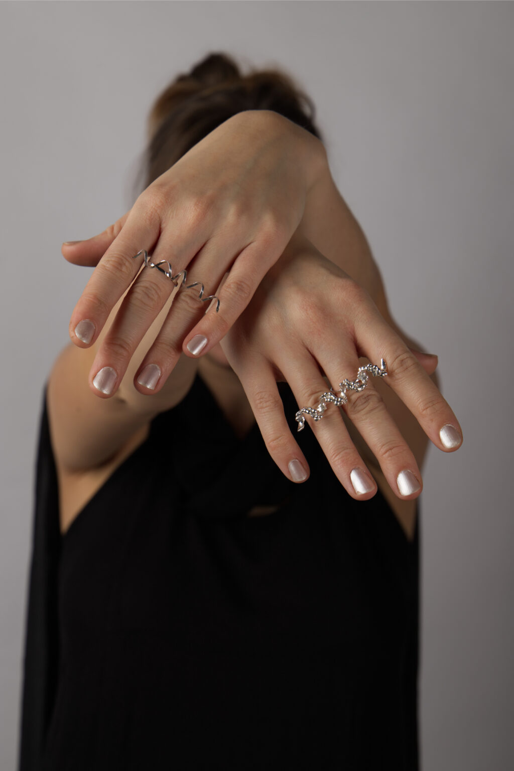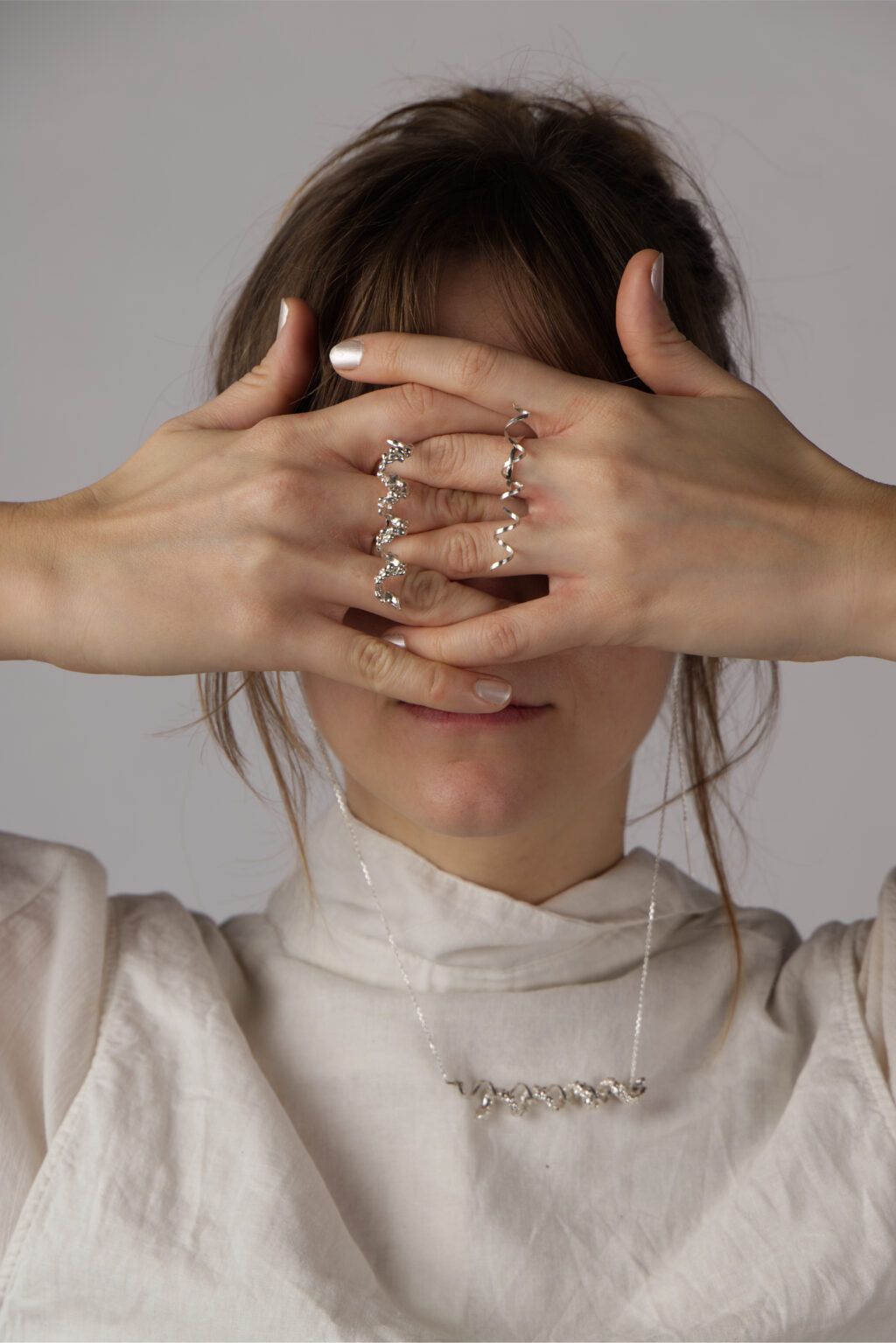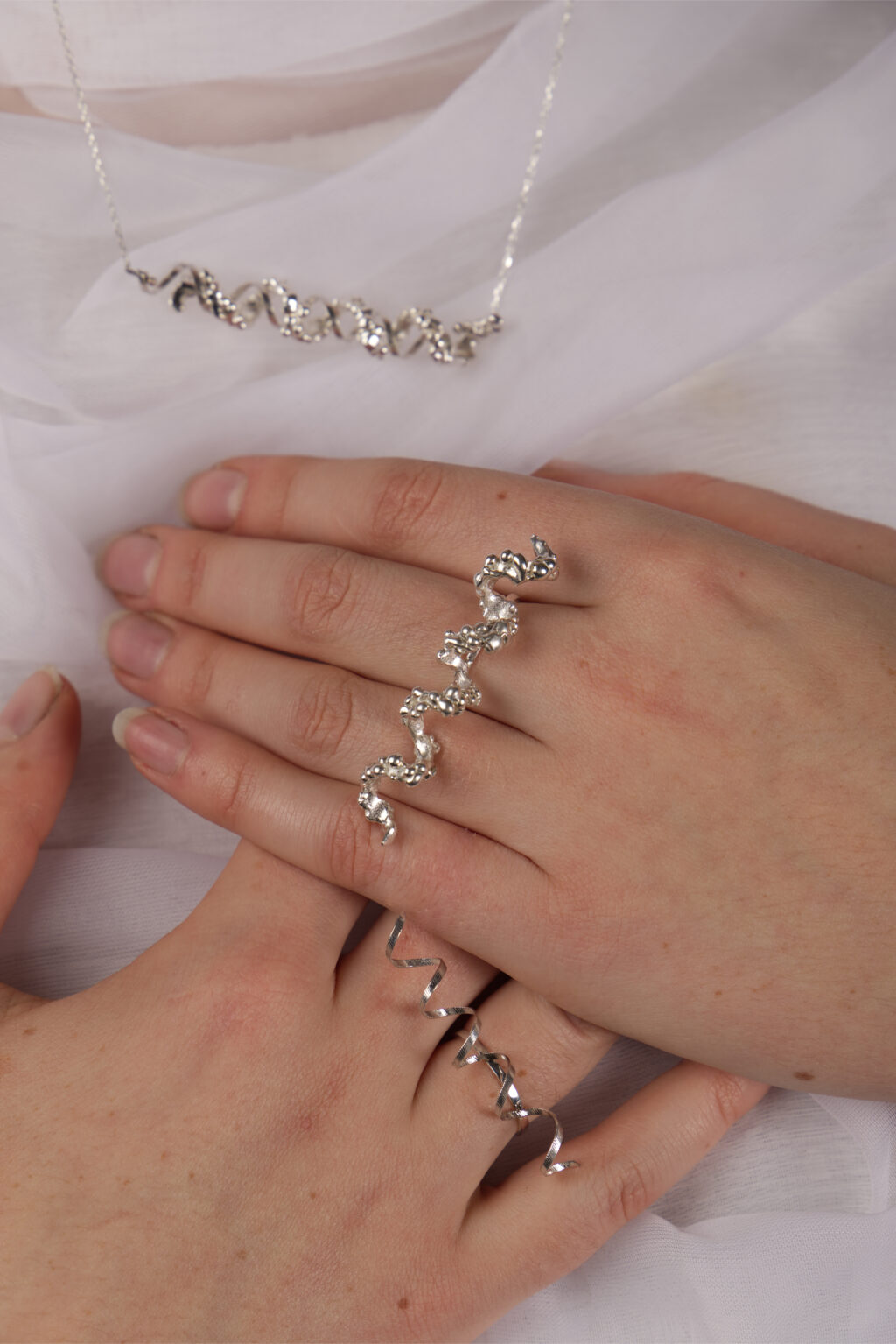 Dvě šroubovice fungují samostatně, ale na těle se propojují a vzniká nový šperk, splétají se a vytvářejí jeden celek – náhrdelník a prsten.