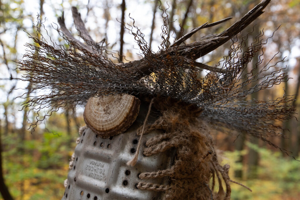 Nájdené kovové predmety boli zháčkované do jedného nositeľného celku s aplikáciou lesných prvkov.