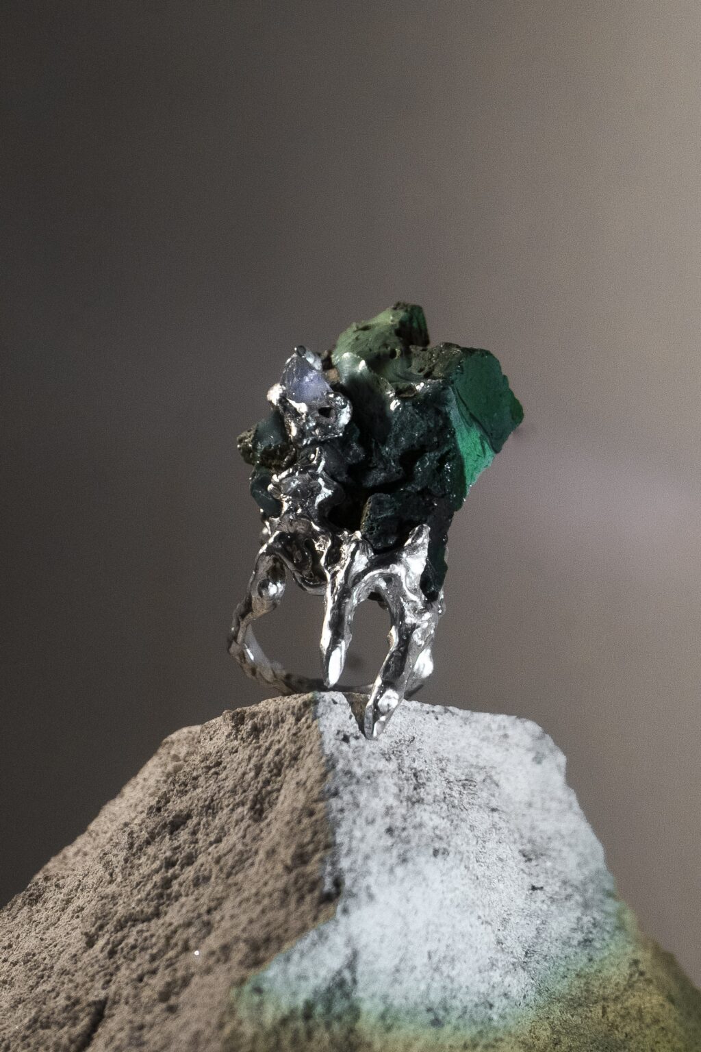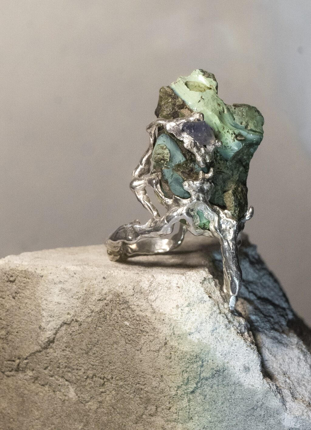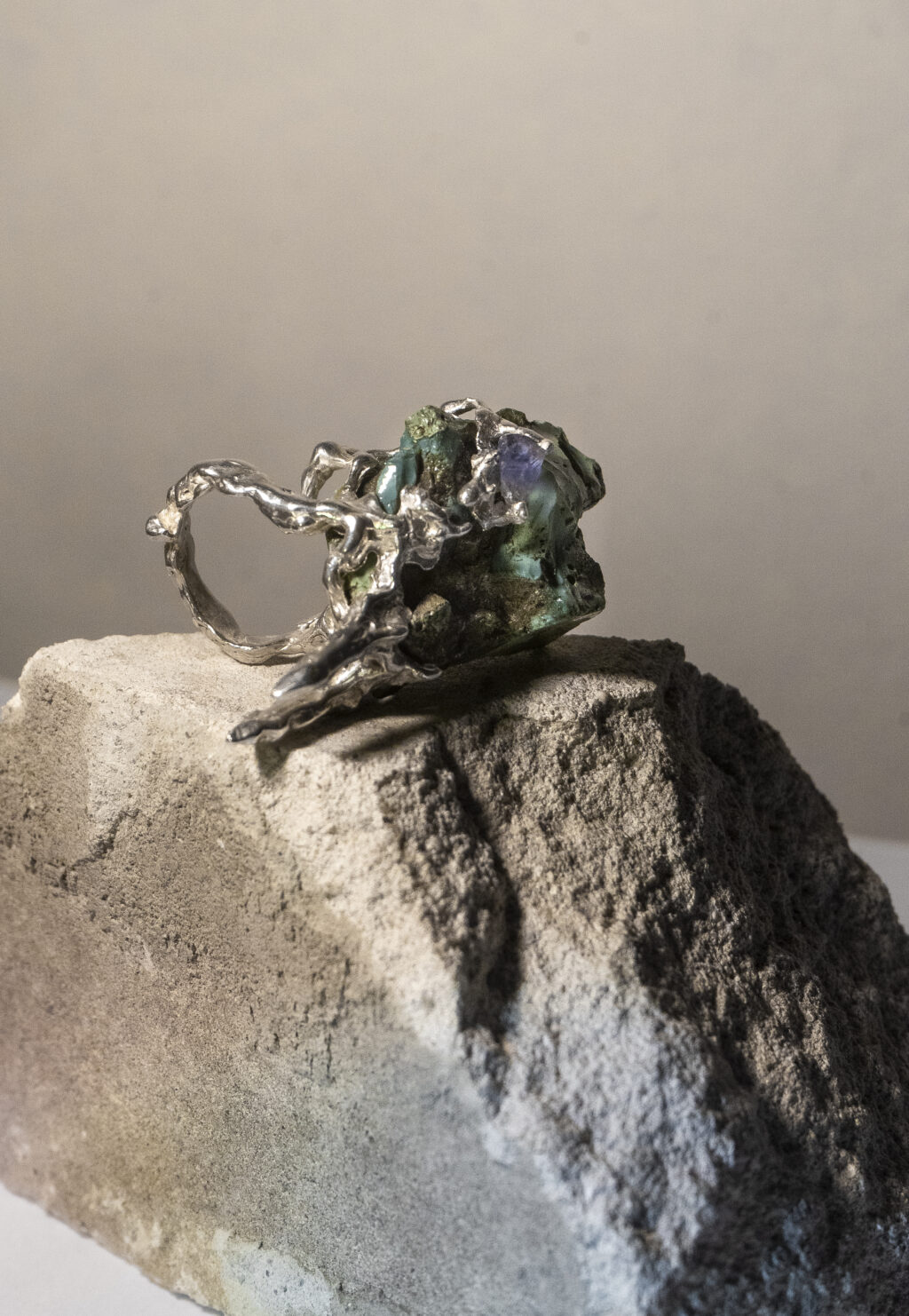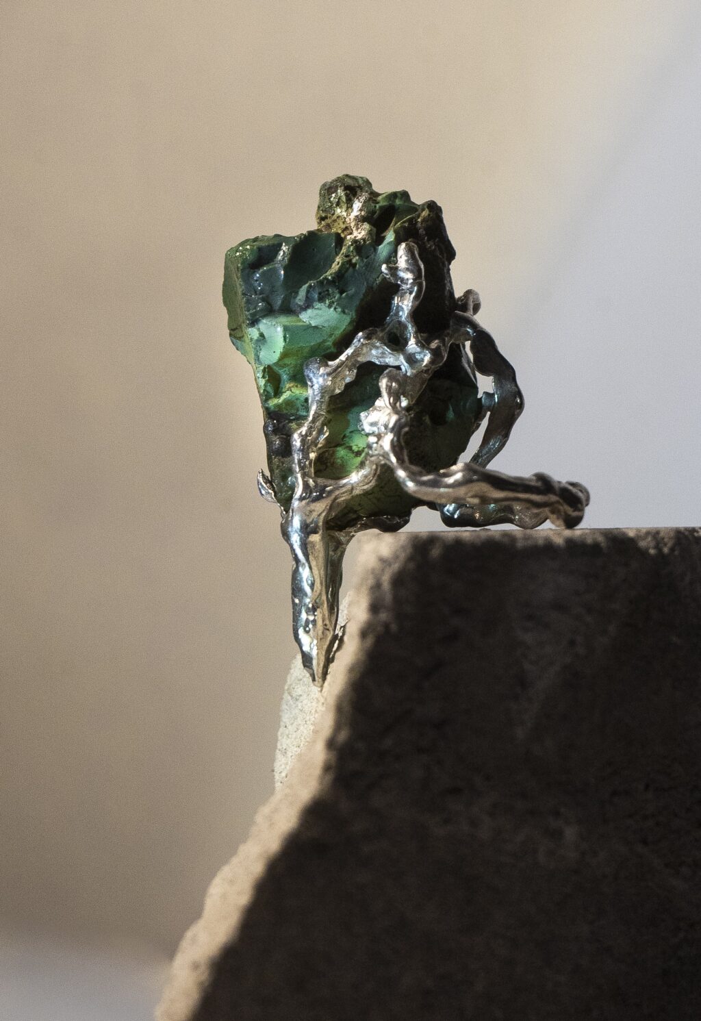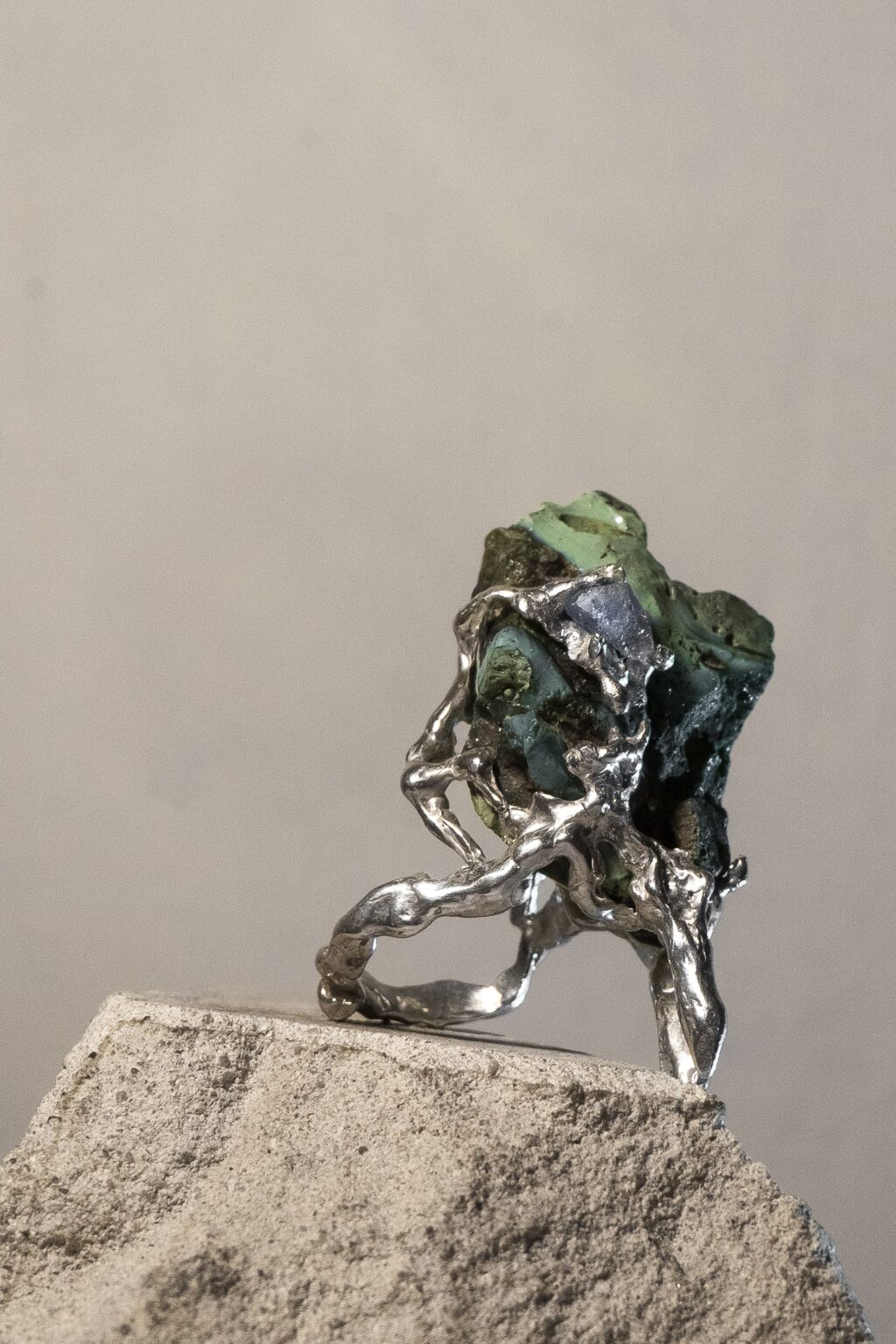 Prsteň inšpirovaný tvorbou Oslana Efnistena. Dominantným prvkom je nájdený kameň pochádzajúci z rieky Hron. Vrstvená štruktúra formovaná pohybom vody je zmesou riečnych kameňov a hmoty vyplavenej z neďalekej fabriky. Prsteň odkazuje na procesy premeny materiálu na hranici prírodného a industriálneho prostredia. Striebro v kombinácii s modrým apatitom dopĺňajú organickú kompozíciu nadväzujúcu na tvorbu Osiana. Šperk je vnímaný ako objekt nesúci stopu miesta a času.