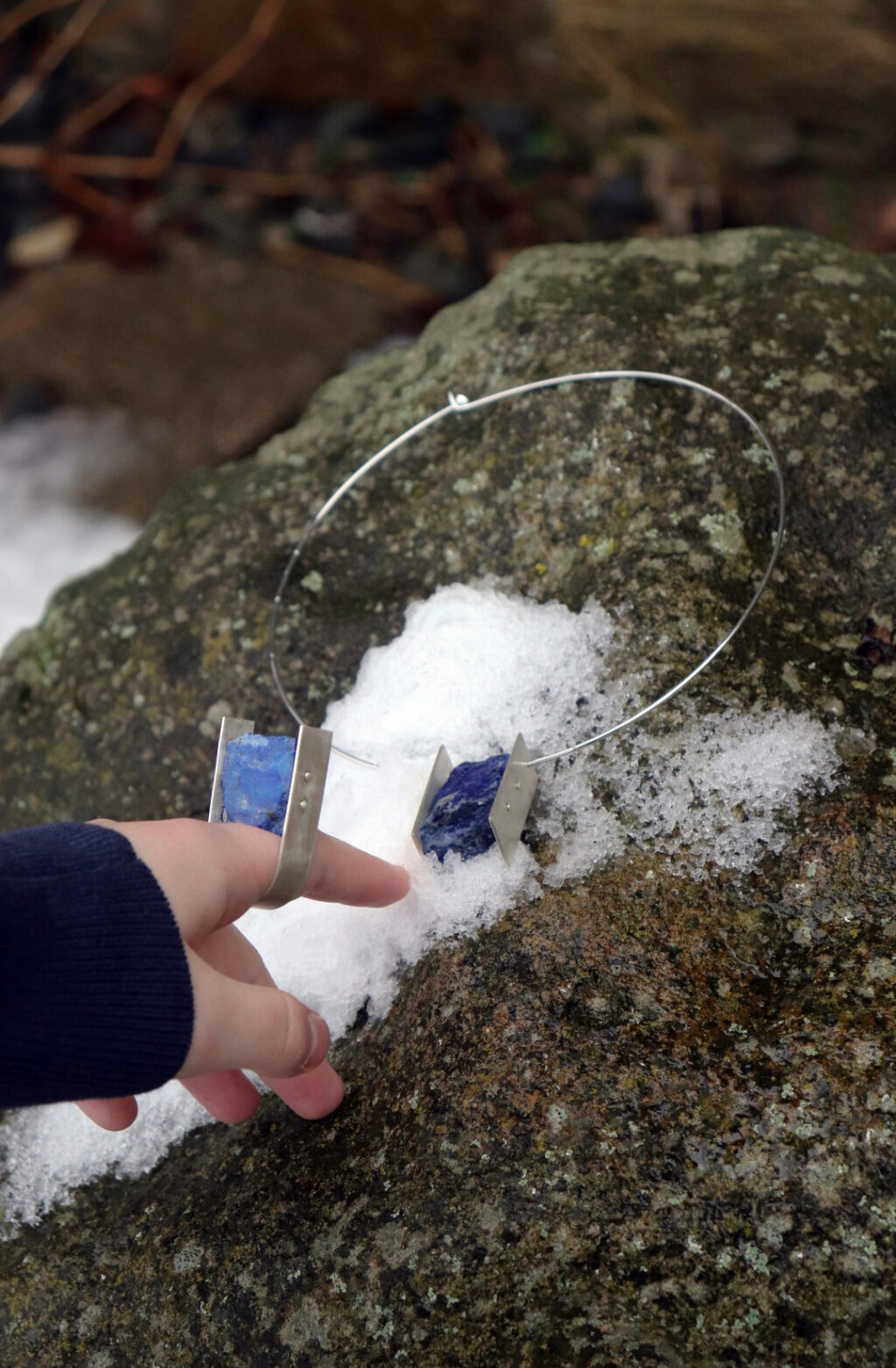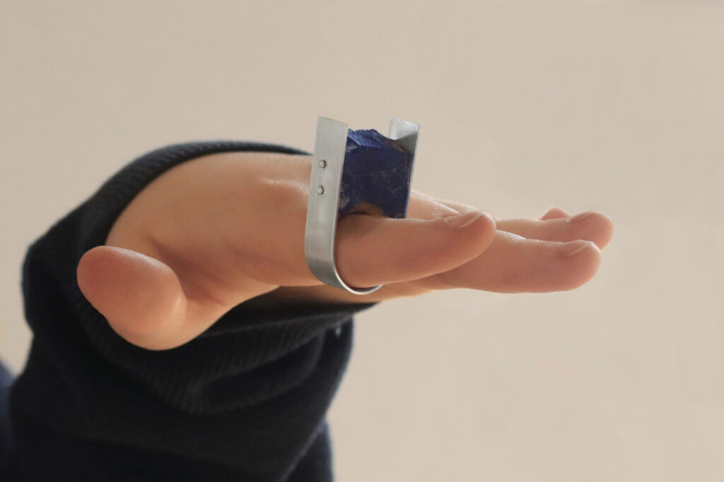 Tento šperk pracuje s tématem space to space jako s přenosem původního prostoru do prostoru nového. Surový kámen zde představuje paměť místa a času, ze kterého pochází. Jeho tvar vznikl bez lidského zásahu. Přesná geometrická konstrukce symbolizuje lidský řád a snahu o kontrolu prostoru. Kámen není do konstrukce zasazen harmonicky, ale je do ní násilně vložen a držen pouze v minimálních bodech. Mezera mezi kamenem a konstrukcí vytváří napětí mezi přírodní hmotou a umělým systémem.