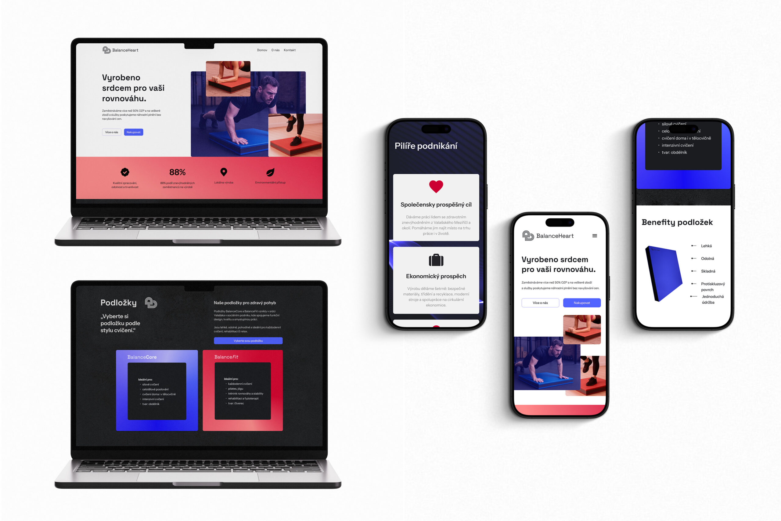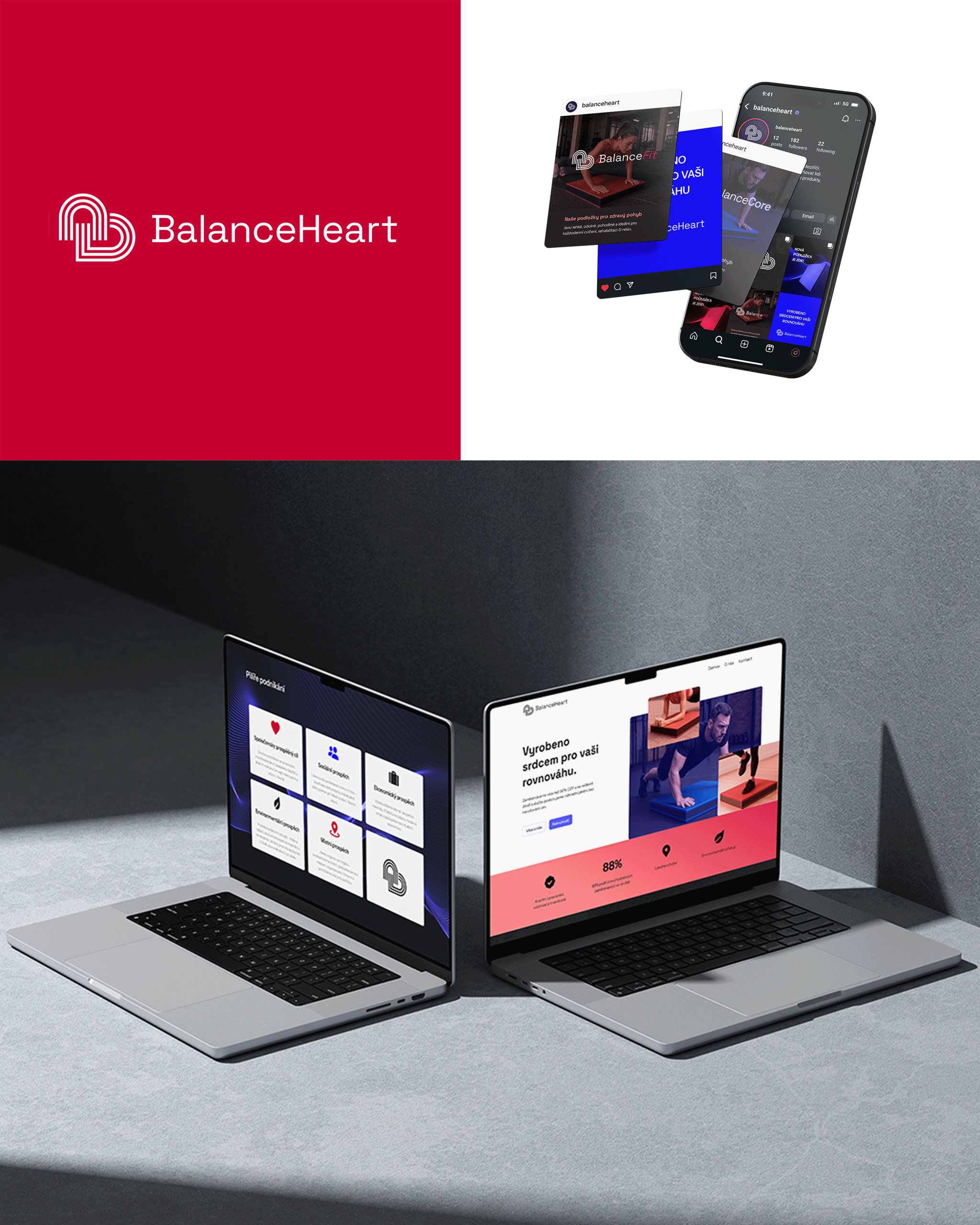V projektu BalanceHeart jsem navrhla vizuální identitu a microweb pro sociální podnik vyrábějící balanční podložky. Design stavím na jednoduchosti, přístupnosti a funkčnosti. Pracuji s čistou typografií, kontrastními přechody a 3D prezentací produktu, která usnadňuje pochopení benefitů a výběr podle typu cvičení. Cílem je srozumitelně a důvěryhodně představit značku i její hodnoty.