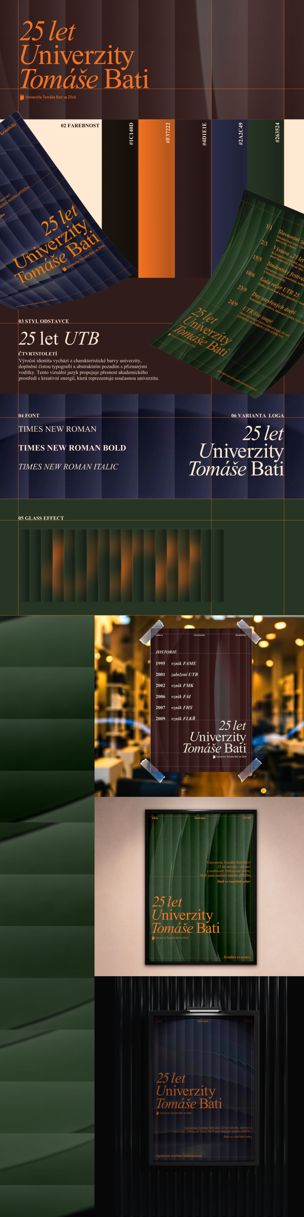 Výroční identita vychází z charakteristické oranžové barvy univerzity, doplněné čistou typografií a abstraktním pozadím s přiznanými vodítky. Tento vizuální jazyk propojuje přesnost akademického prostředí s kreativní energií, která reprezentuje současnou univerzitu. Identita se snaží působit elegantně a uctivě k originálnímu vizuálu UTB.