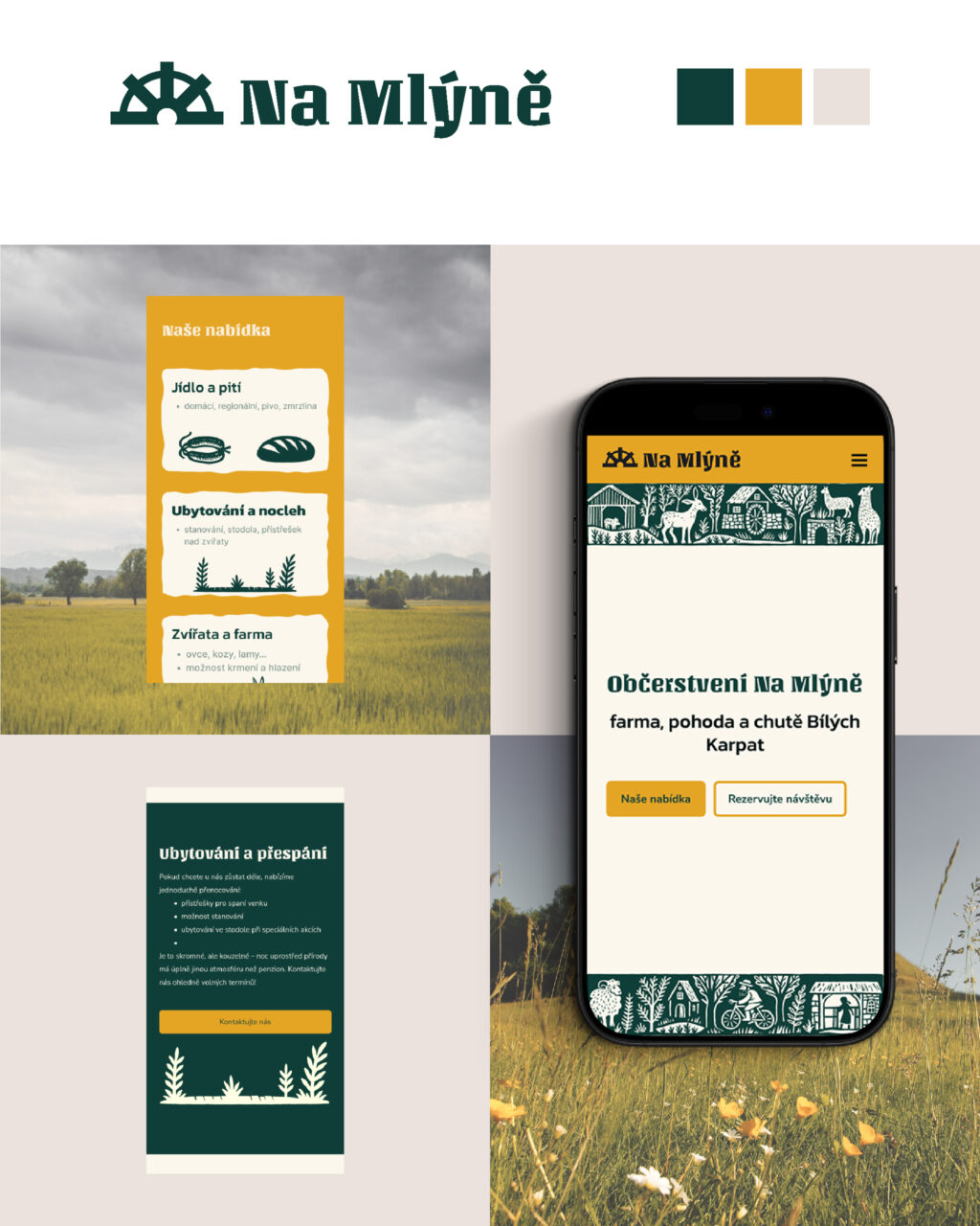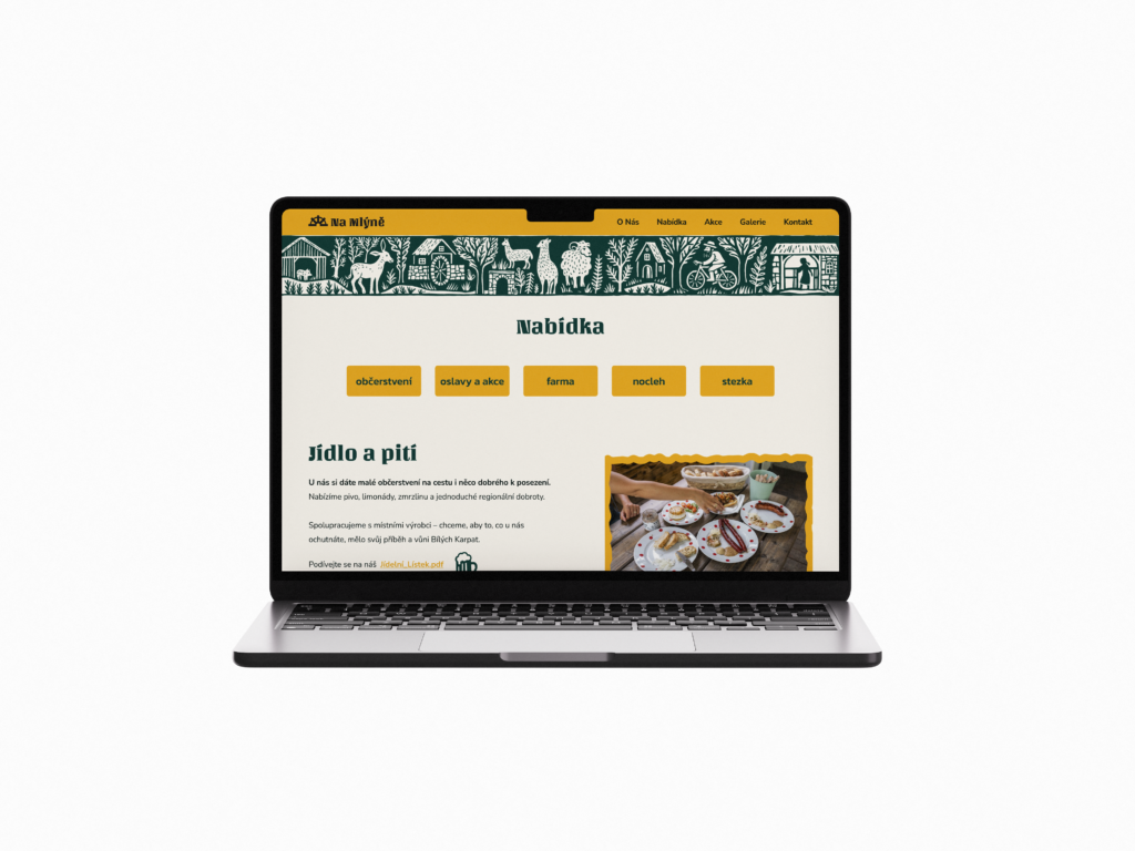 Občerstvení Na Mlýně představuje web a vizuální identitu lokálního podniku v historickém prostředí mlýna. Design klade důraz na příběhovost místa a jeho atmosféru. Pracuje s lidovými motivy, ilustracemi ve stylu dřevořezu a tlumenou barevností, které vytvářejí pohádkový charakter. Web zůstává přehledný a zároveň posiluje silnou místní identitu.