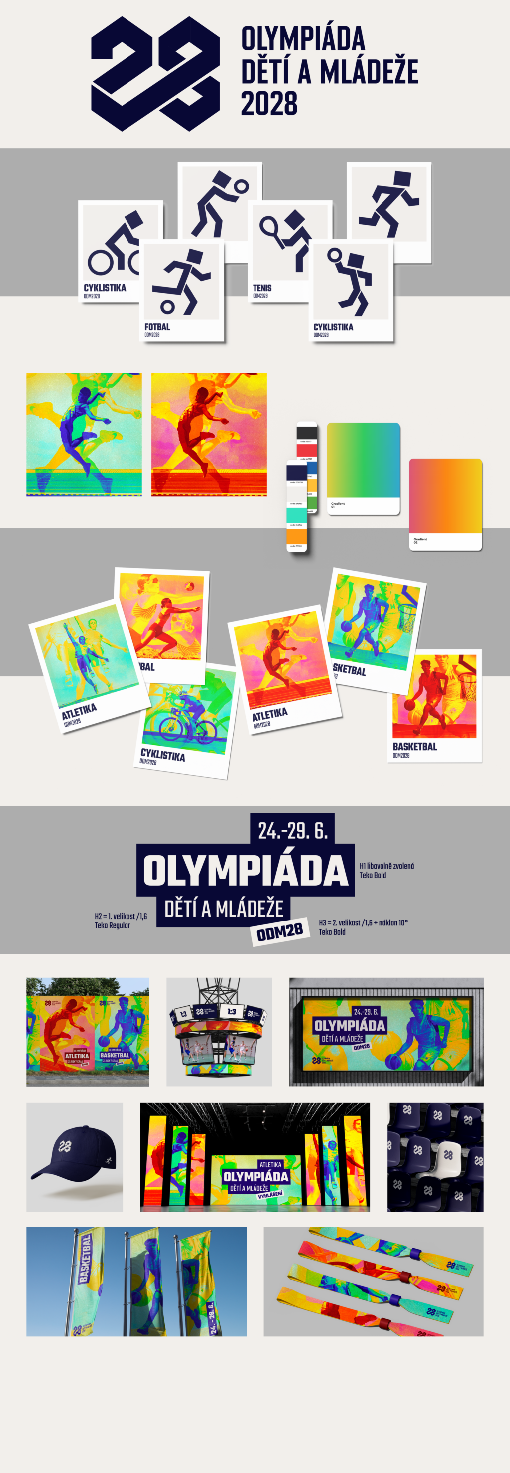 Projekt se zaměřuje na návrh vizuální identity pro Olympiádu dětí a mládeže 2028 ve Zlínském kraji. Cílem bylo do vizuálu přenést mladistvost, energii a pohyb. Logo vychází z čísla 28 a je stylizováno kombinací typografie inspirované sportovními dresy a odkazů na zlínskou architekturu. Barevná paleta zůstává v tradičních barvách, které jsou však omlazené a zesvětlené pro svěžejší a současný výraz. Hlavním vizuálním prvkem jsou barevně stylizované fotografie sportovců, kde se jeden pohybový okamžik objevuje třikrát, čímž vzniká dynamický efekt. Pro práci s textem byl navržen jednoduchý blokový systém, který umožňuje snadnou a konzistentní aplikaci napříč různými výstupy.