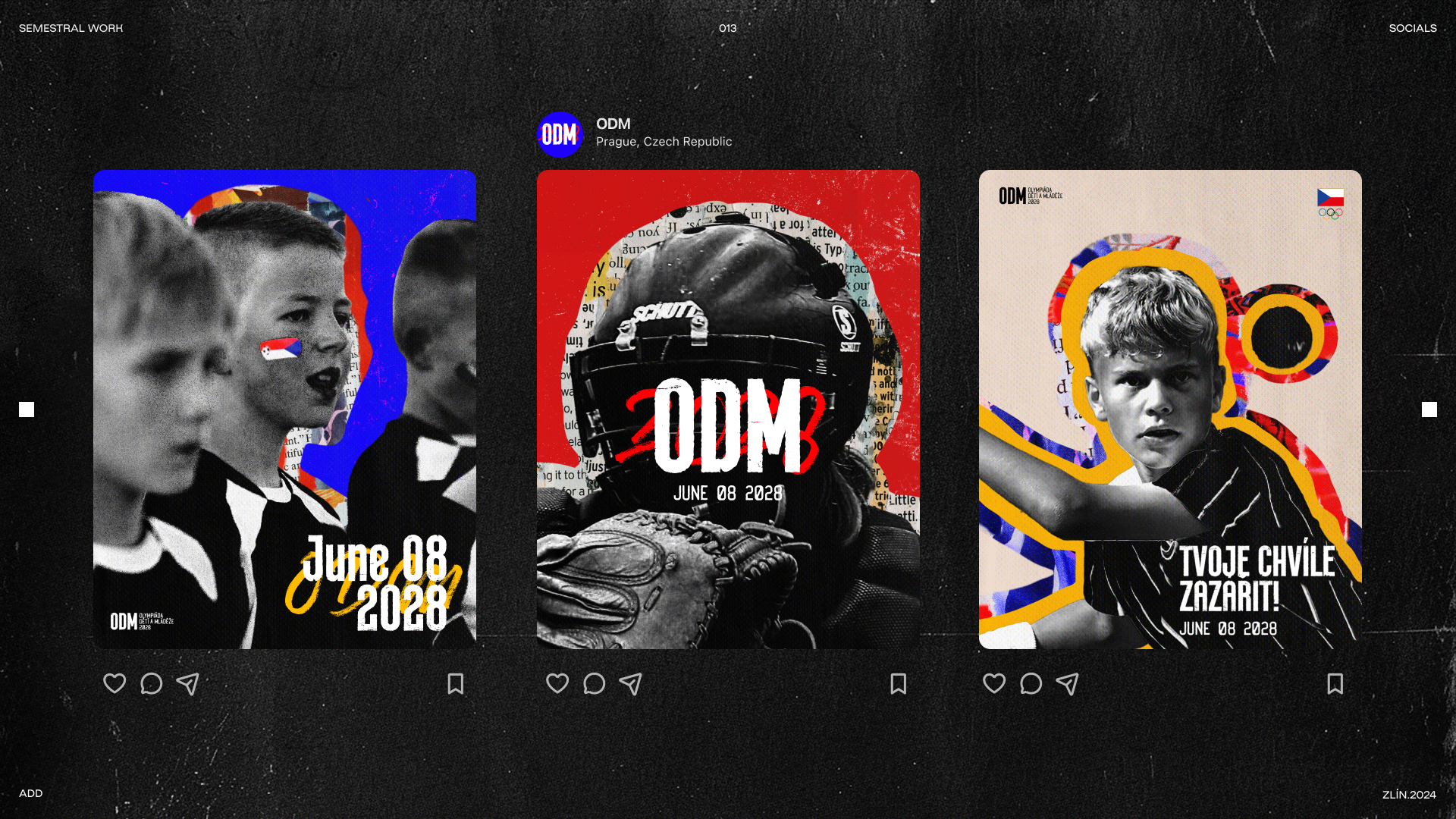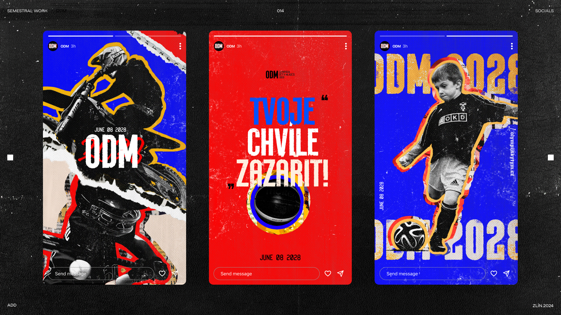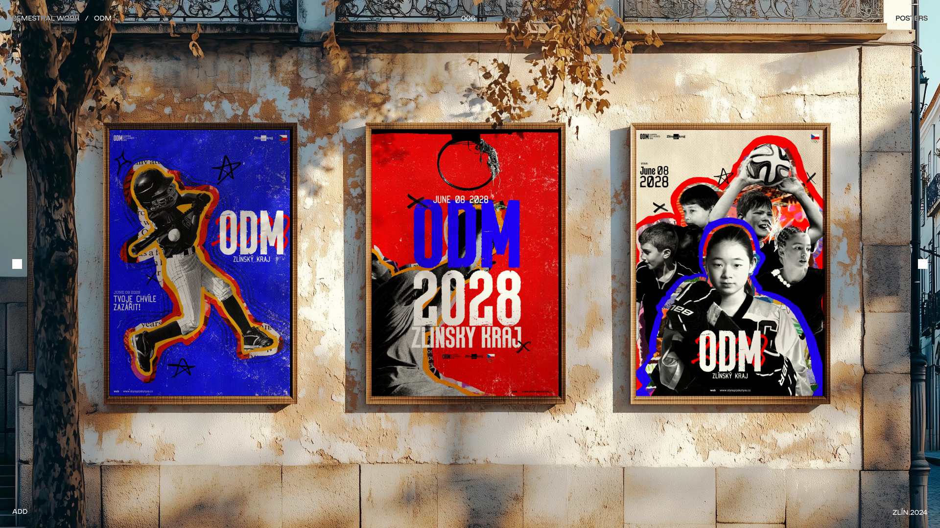 Projekt Olympiáda dětí a mládeže 2028 se zaměřuje na návrh vizuální identity letní olympiády ve Zlínském kraji. Zvolila jsem grungeový styl inspirovaný dynamikou sportu a energií mládeže. Pracuji s hlavními barvami Zlína a České republiky – žlutou, modrou, bílou a červenou. Vizuál stavím na výrazných texturách, kolážové práci s fotografií a ručně kreslených markerových sticích, které podporují pocit pohybu. Výsledkem je sada grafických výstupů, merch produkty a animace prezentující jednotný vizuální styl.