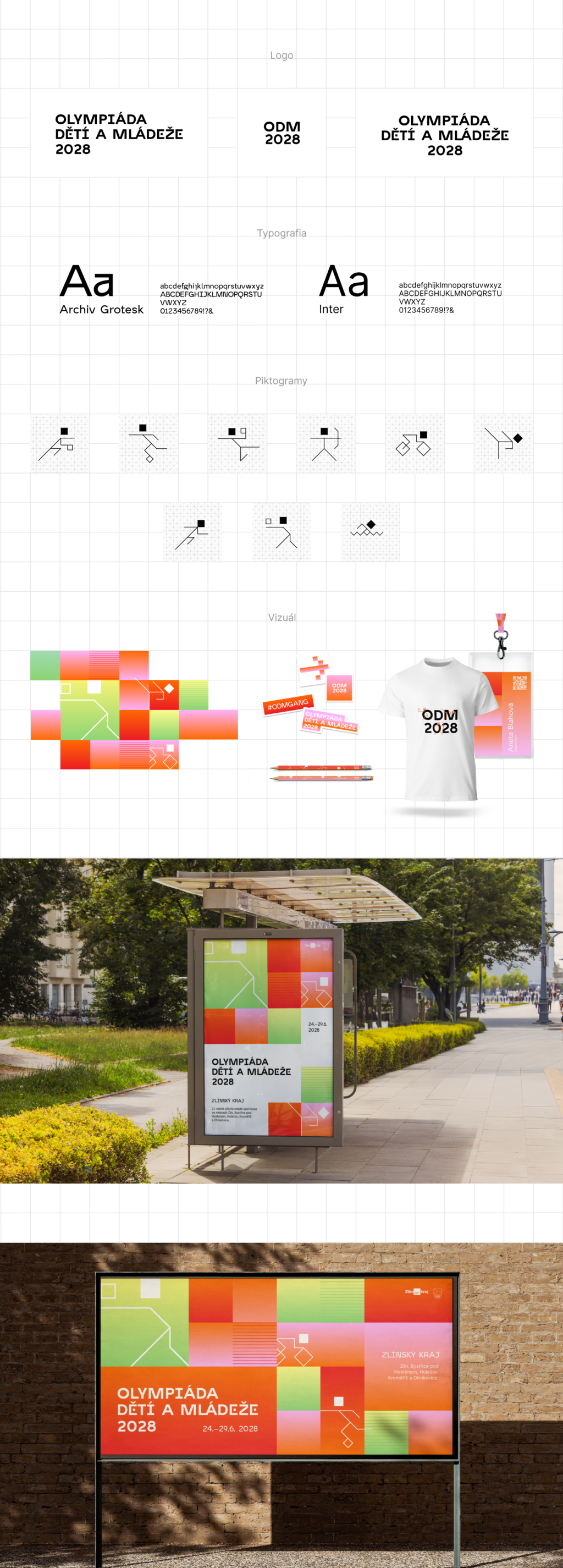 Na rozdiel od predchádzajúcich ročníkov som zvolila iný prístup. Základným grafickým prvkom sa stal štvorec. Logo je čisto typografické, postavené na geometrickom písme, ktoré sa konzistentne objavuje naprieč celým vizuálom. Piktogramy nemajú tradične guľaté, ale štvorcové hlavy – Zlínsky kraj si totiž dovolí byť iný – sú navrhnuté minimalisticky, no zároveň hravo. Farebnosť reflektuje kombináciu tehlových tónov a prírodných farieb. Sekundárnym vizuálnym prvkom sú vertikálne línie, ktoré odkazujú na pohyb a šport. Celý vizuál tak pôsobí jednotne, dynamicky a živo.