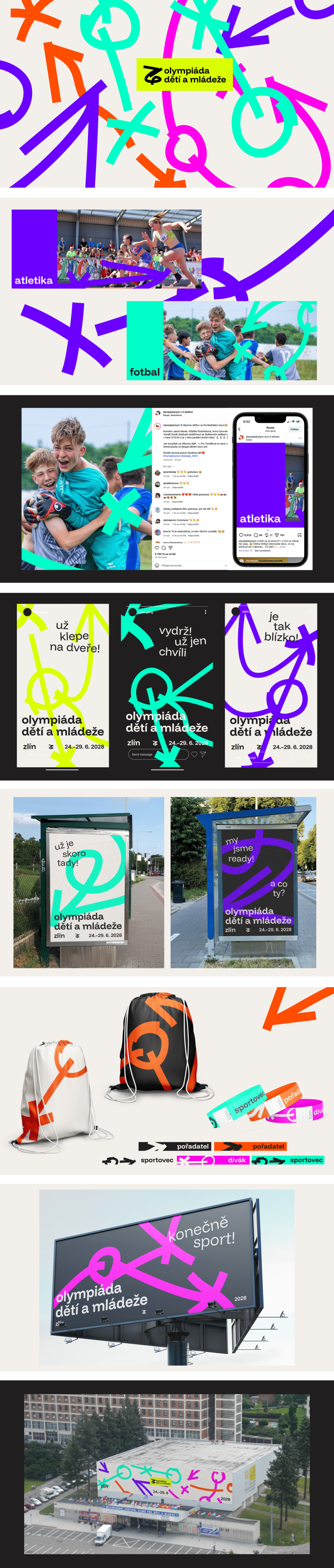 V roce 2028 se Olympiáda dětí a mládeže uskuteční ve Zlínském kraji. Zapomeňte na ilustrované míče a florbalové hole. Neotřelá a moderní vizuální identita je tvořena modulárními prvky (náčrty), jenž vychází z trenérských skic, které jsou pro sportovce při analýze jejich tréninku a výsledků klíčové. Identita je odvážná a hravá, ale ne dětinská. Skvěle odráží charakter Zlínského kraje, který sám sebe prezentuje jako Kraj bez hranic. Sportu třikrát zdar!