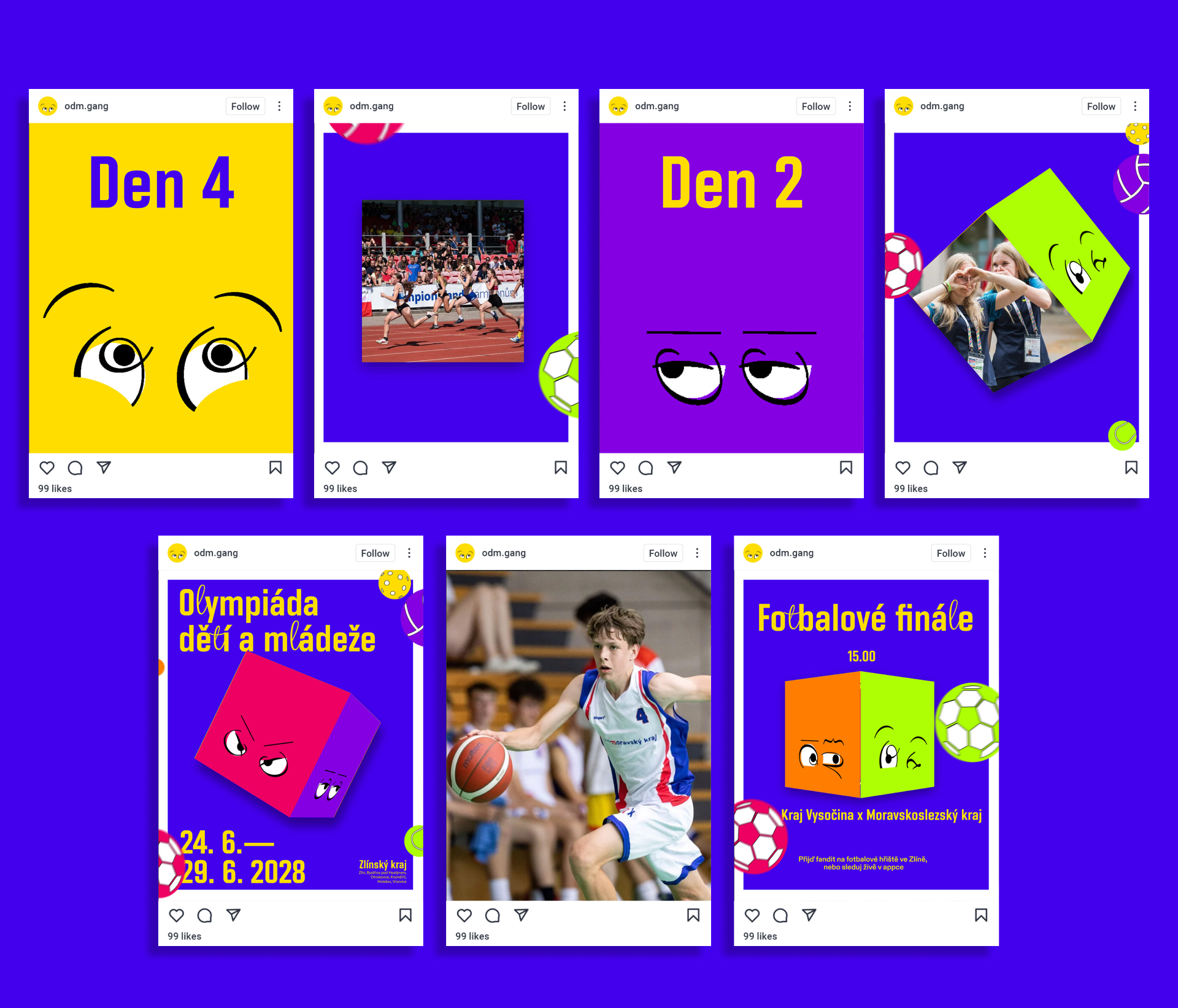 Při tvorbě vizuální identity pro Olympiádu dětí a mládeže 2028 ve Zlínském kraji jsem se zaměřila na propojení regionu, sportu a emocí, které ke sportu patří. Cílem bylo vytvořit hravou a „cool“ identitu atraktivní pro děti a dospívající. Základním prvkem se stal čtverec, vycházející z loga Zlínského kraje. Ten jsem propojila s emocemi – vzniklo šest emotivních výrazů, protože se ODM bude odehrávat v šesti městech Zlínského kraje. Tyto čtverce společně vytvářejí kostku – prvek symbolizující hry a pohyb. V návrhu do kostky naráží sportovní náčiní, dynamicky s ní otáčí – vzniká tak vizuální hra se sporty, emocemi i pohybem.