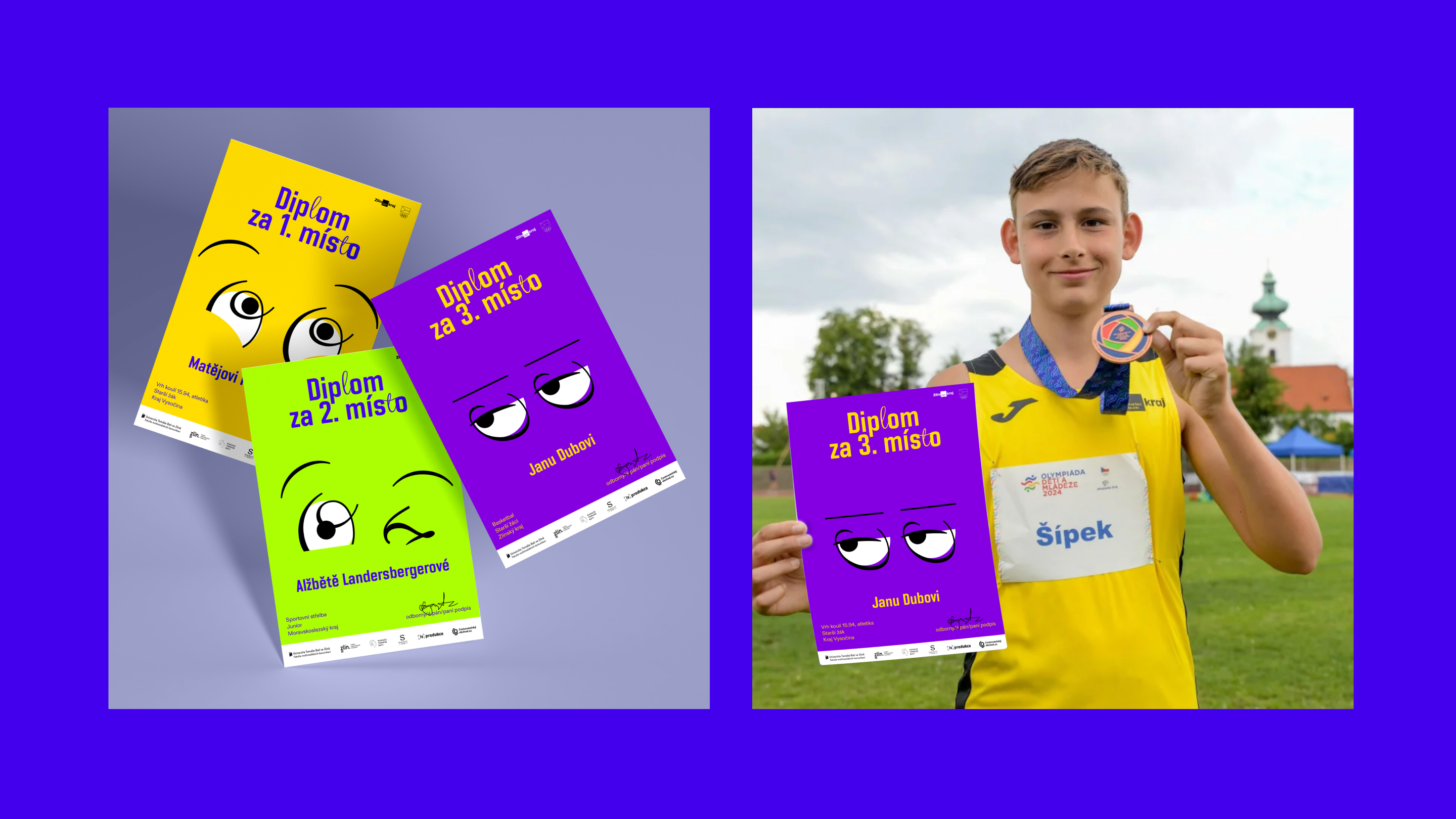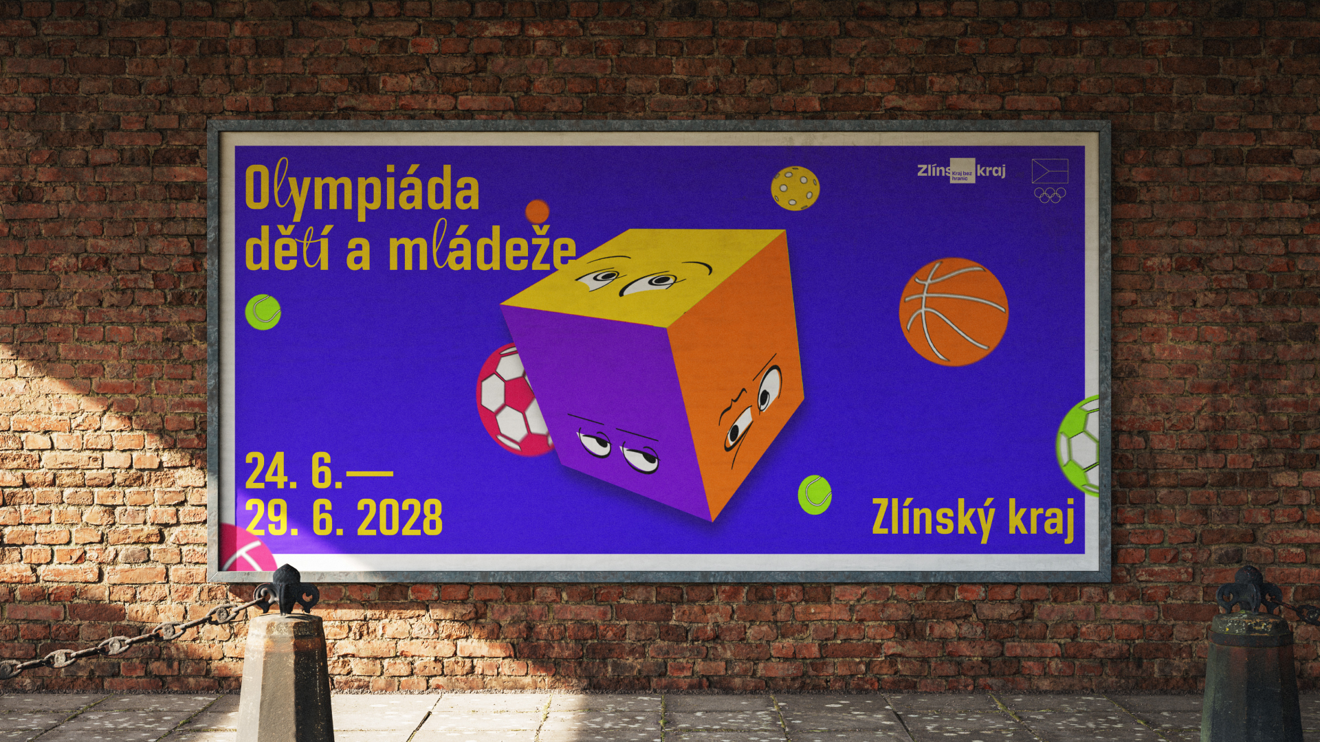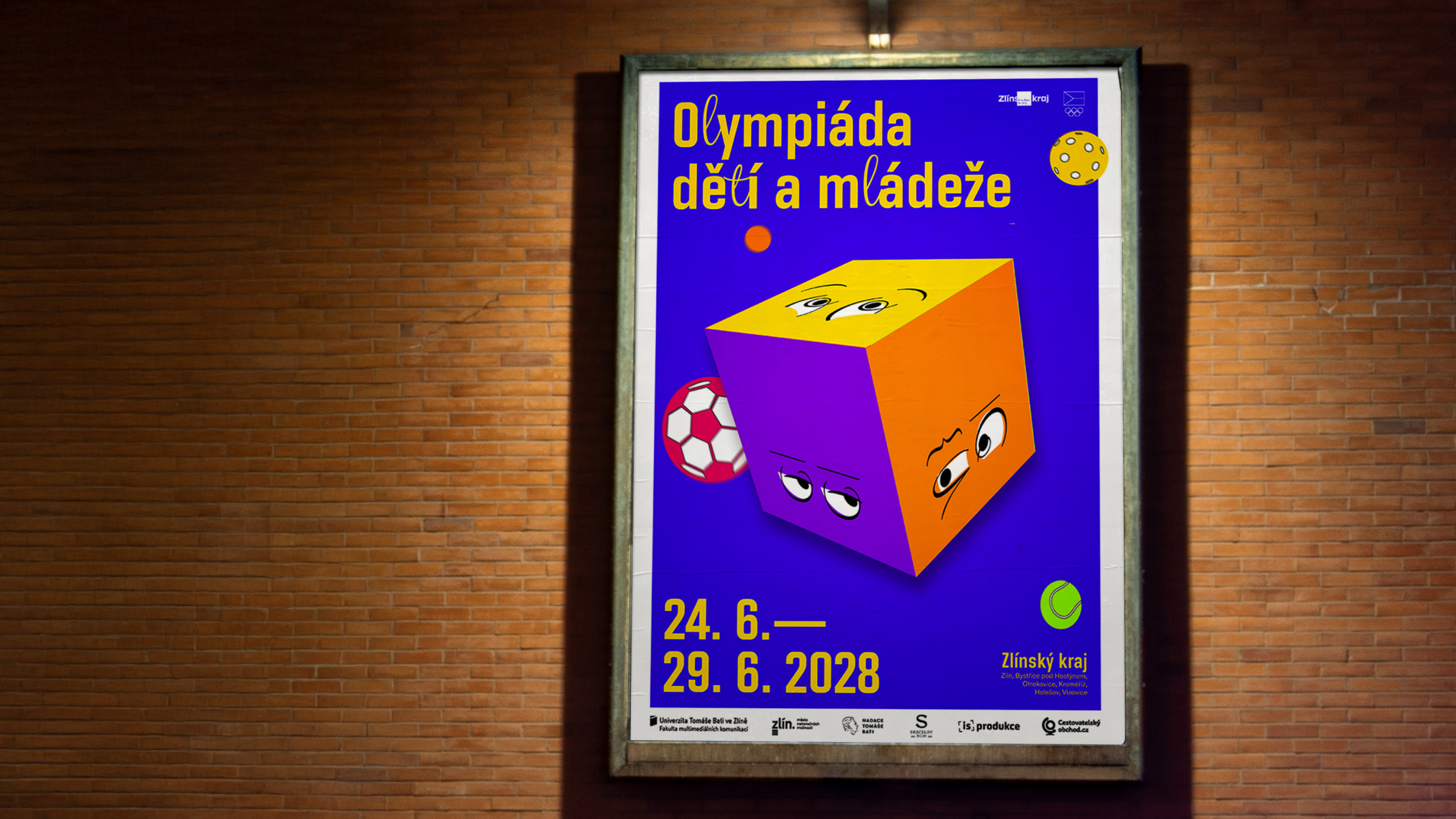 Barevnost vychází z oficiálních olympijských barev, které jsem upravila do pestřejší a hravější podoby vhodné pro mladší publikum. Černou jsem záměrně nahradila fialovou. Primární barvy jsou modrá a žlutá, které zase odkazují na Zlínský kraj. Použité písmo respektuje oficiální typografii ODM, kterou jsem jemně oživila skriptovými prvky u písmen „l“ a „t“. Ze skriptového fontu jsou poskládané i obličeje emocí. Výsledkem je flexibilní vizuální systém založený primárně na motionu, ze kterého vycházejí plakáty a další statické výstupy. Logo má tři varianty. Kostka funguje také jako maska pro fotografie, díky čemuž vizuál dobře funguje jak v čistě grafické podobě, tak i v kombinaci s fotografií.