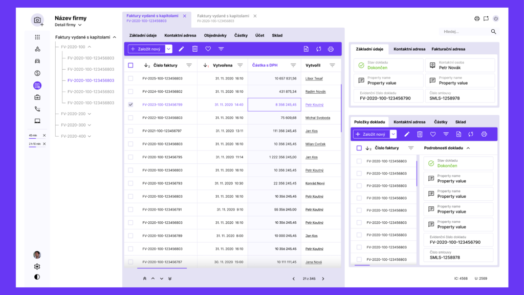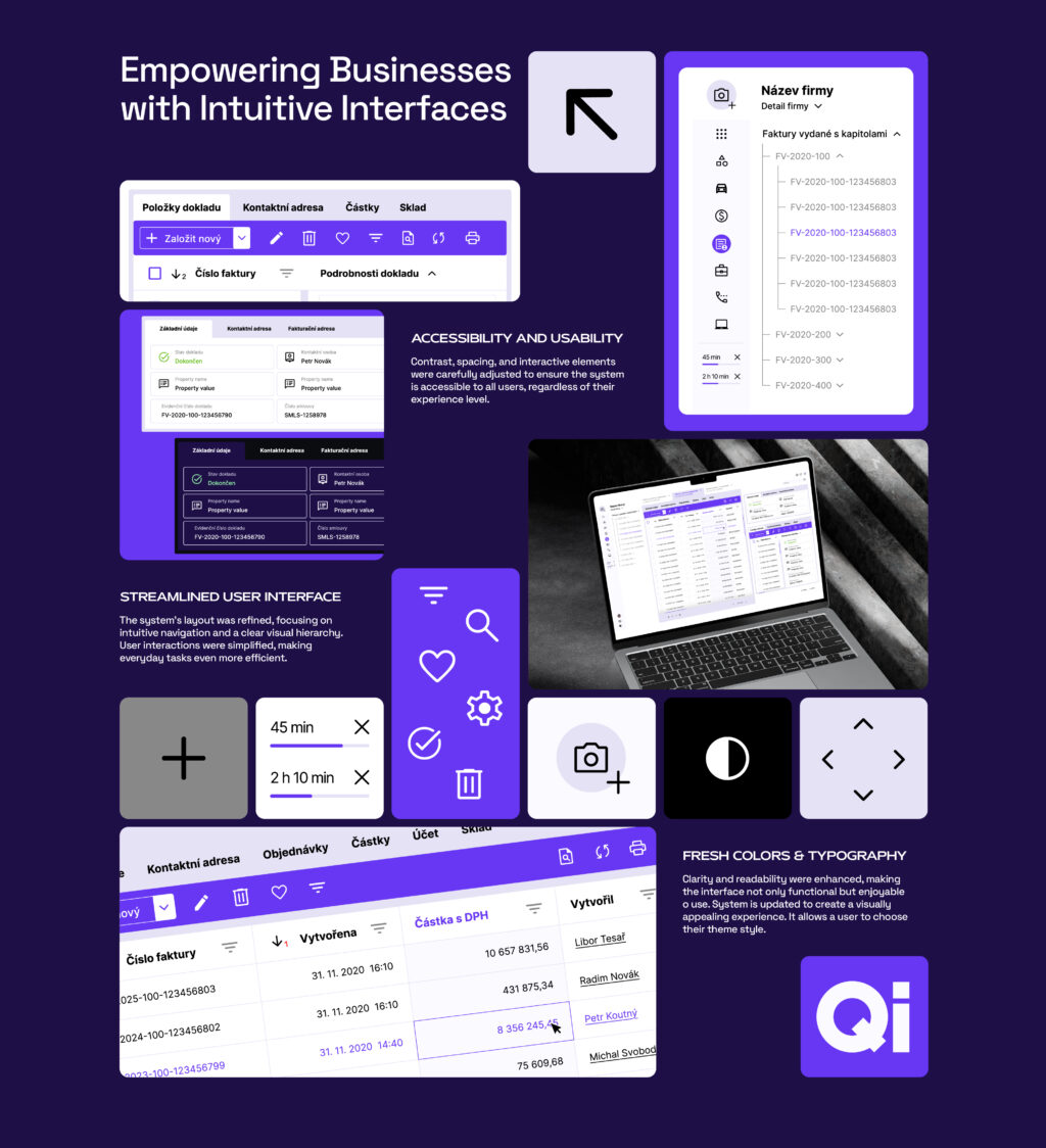 Projekt byl zaměřený na vizuální a funkční proměnu rozsáhlého ERP systému od QI Group. Vytvořený design system sjednocuje vzhled i chování rozhraní napříč celou platformou. Zvolený vizuální styl, včetně písma, barev a uspořádání prvků, vytváří jednotné a snadno čitelné prostředí, které usnadňuje každodenní práci v systému. Hlavním cílem byla přehlednost, zlepšení vizuální hierarchie a celkový uživatelský komfort.