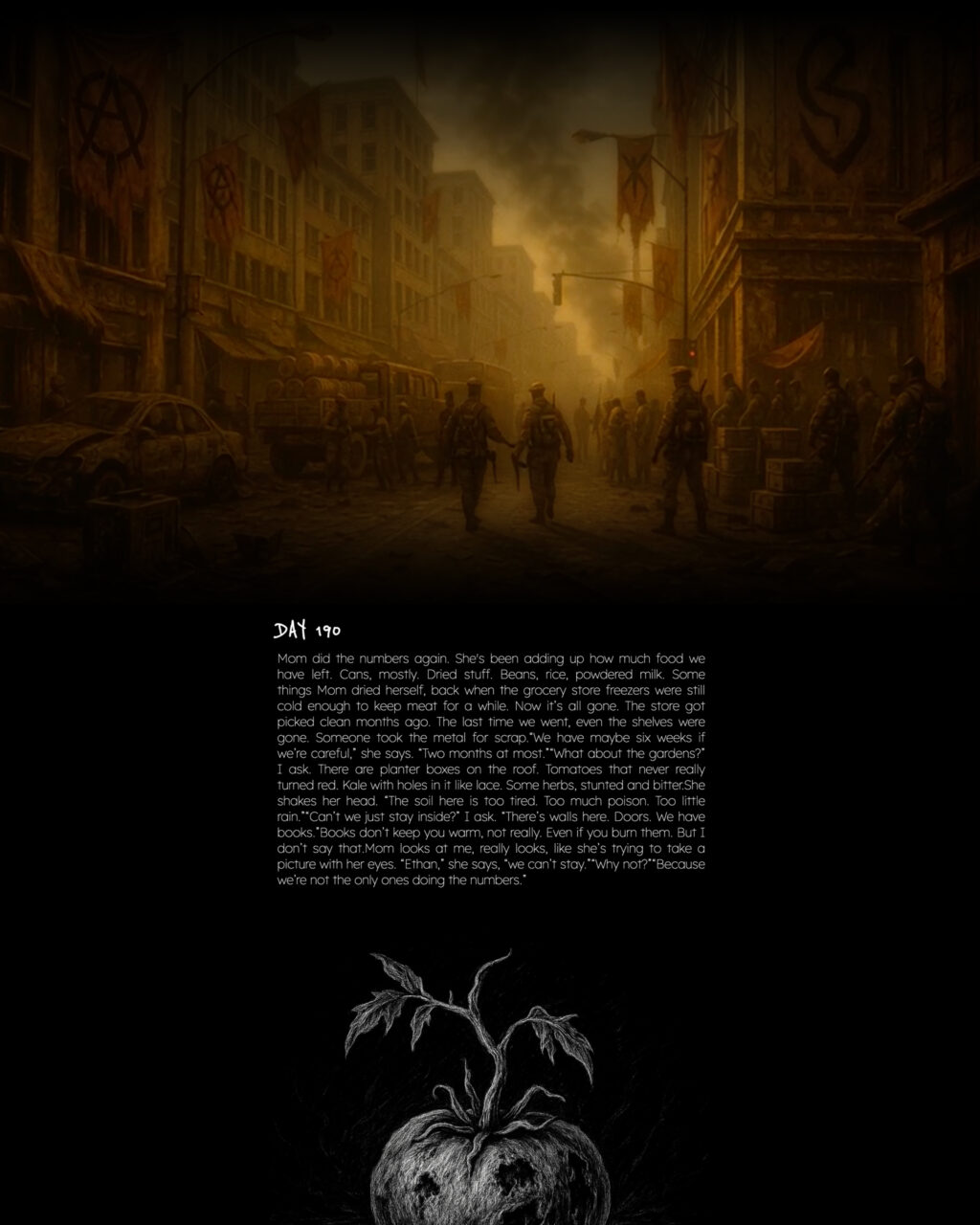 Malá webová stránka vytvořená ve Weblow, obsahuje dva deníky mladých adolescentů. Časová linka u prvního deníku se odehrává zhruba 100 let v budoucnosti, 165 dní po odletu mocných, vlivných a bohatých skupin lidí, kteří mají za cíl populovat novou planetu. První deník je psán z perspektivy mladého hocha, který se svojí matkou musel zůstat na planetě zemi.