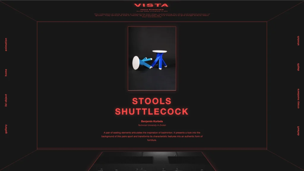 Projekt Space to Space zkoumá možnosti práce s perspektivou v digitálním prostředí. Výsledkem je experimentální webová platforma, která vytváří imerzivní prostor pro prezentaci různorodého obsahu – od prostého textu a obrazu přes video až po 3D modely – zasazeného do hloubkové perspektivní kompozice.