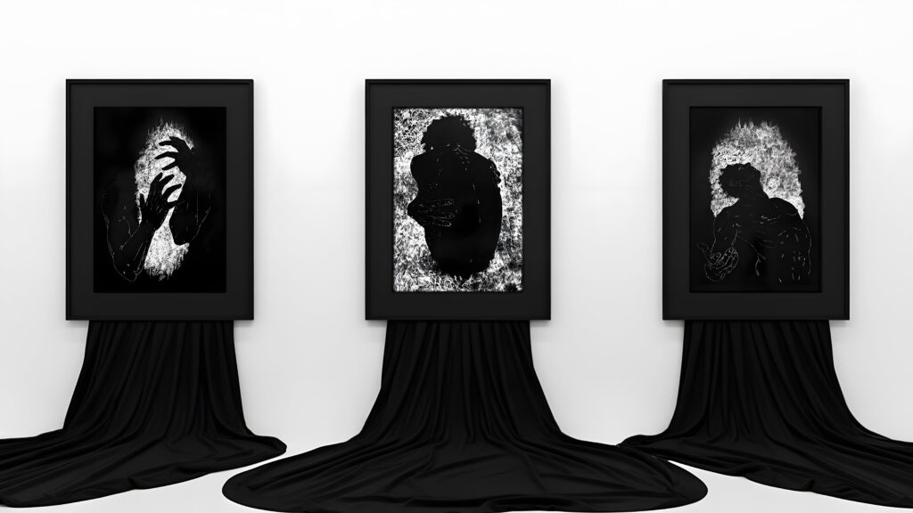 Kompozície troch zvolených figurálnych póz reprezentujú tri emocionálne stavy: neistotu, osamelosť a nádej. Neistota pracuje s deformáciou siluety. Hlavu a hruď spája dynamický chaos, ktorý vizuálne pripomína vnútorné napätie a mentálnu neukotvenosť. Krčovité gesto rúk podporuje dojem vnútorného boja. Svetlo tu reaguje najcitlivejšie – blízkosť človeka chaos upokojuje a stabilizuje.