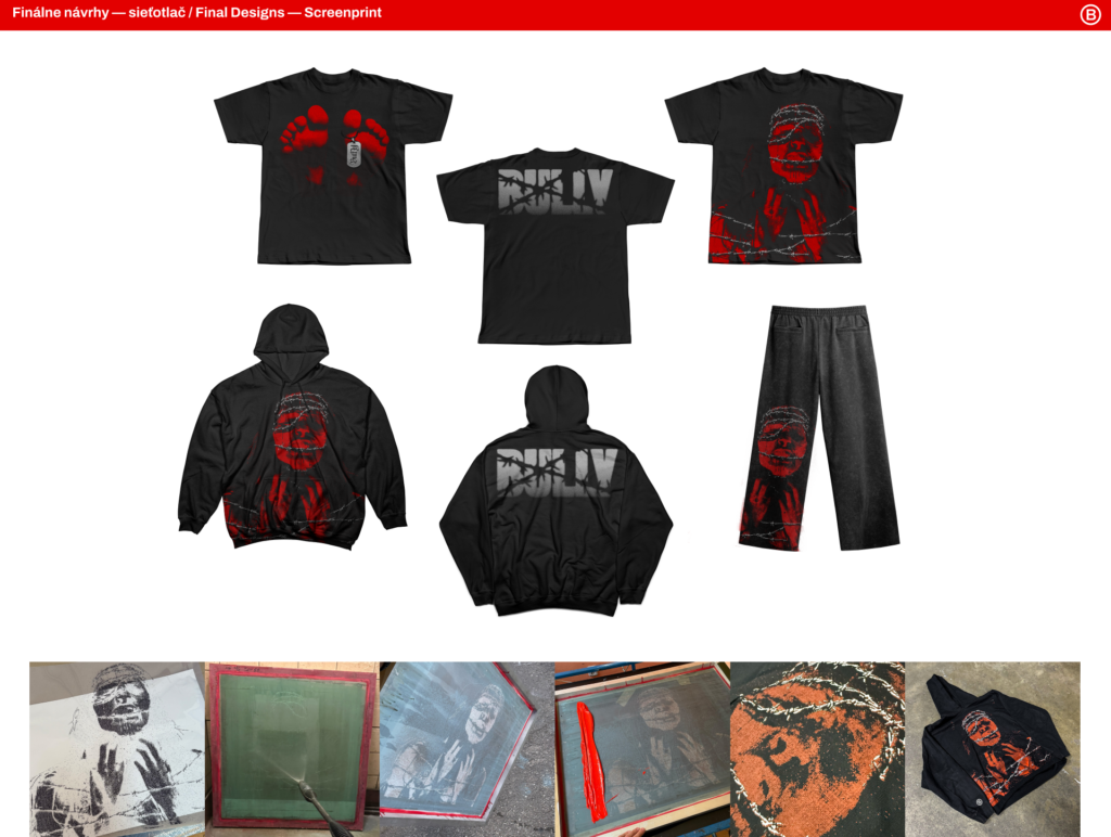 Môj bakalársky projekt sa venoval tvorbe streetwear značky Bully, môjho vlastného brandu vychádzajúceho z myšlienok hiphopovej a metalovej hudby, kultúry streetwearu a skateboardingu.