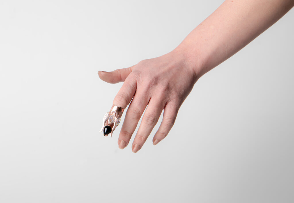 The lip jewelry has an empty hole in it in the shape of the onyx used on the ring. The ring is made on the second joint of the index finger, is shaped like a fork and has an onyx on its top. When the fork is placed to the lips, the empty space is filled with the onyx on the ring.