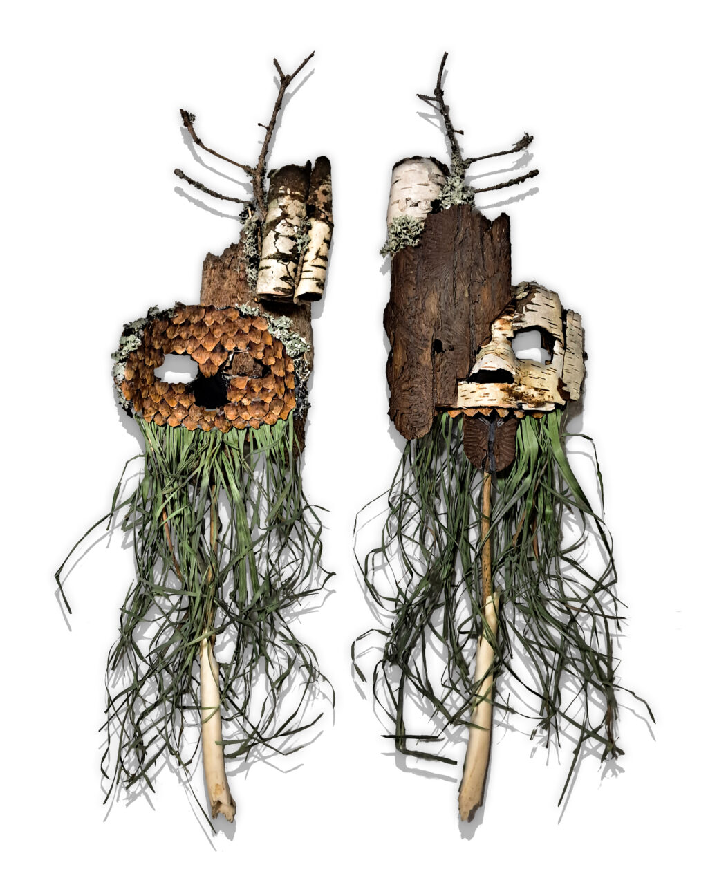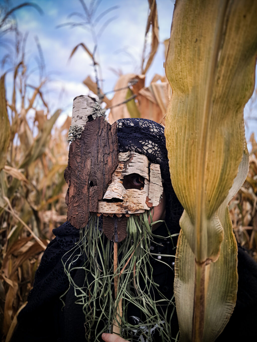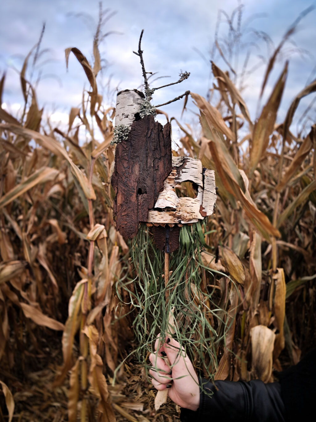 As adults, our minds are often overwhelmed by problems and worries. This can lead us to long for our carefree childhood we used to have. Looking through the mask provides the opportunity to re-enter the child’s body and relive through these feelings of joy and mischief. The mask depicts a child peeking out from behind a tree. It is dominated by the color white, which symbolizes youth and innocence of childhood.