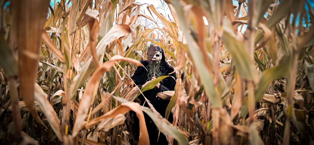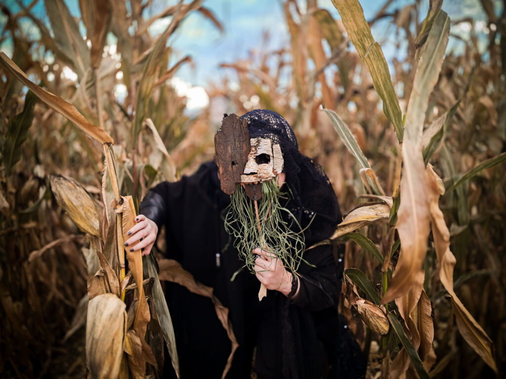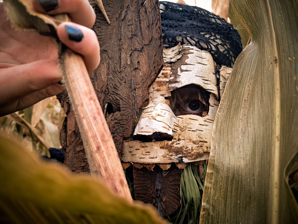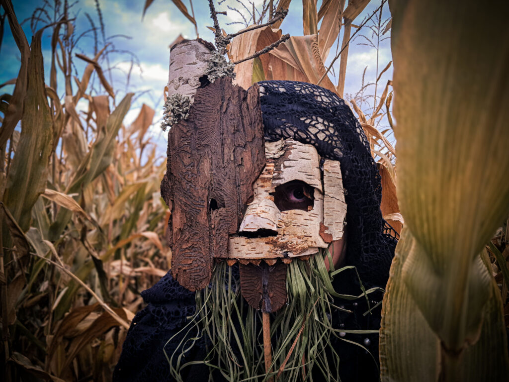 As adults, our minds are often overwhelmed by problems and worries. This can lead us to long for our carefree childhood we used to have. Looking through the mask provides the opportunity to re-enter the child’s body and relive through these feelings of joy and mischief. The mask depicts a child peeking out from behind a tree. It is dominated by the color white, which symbolizes youth and innocence of childhood.