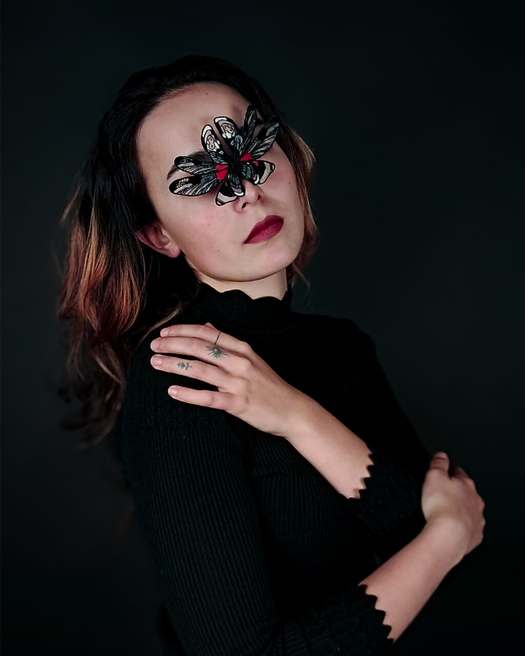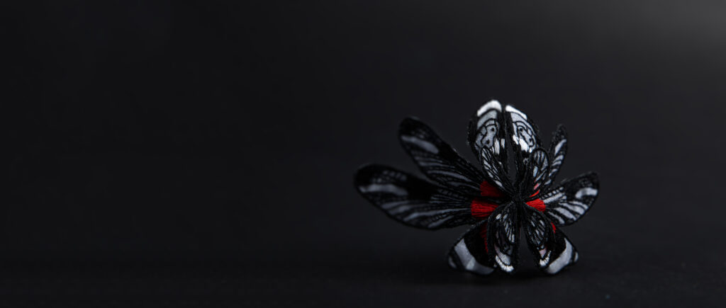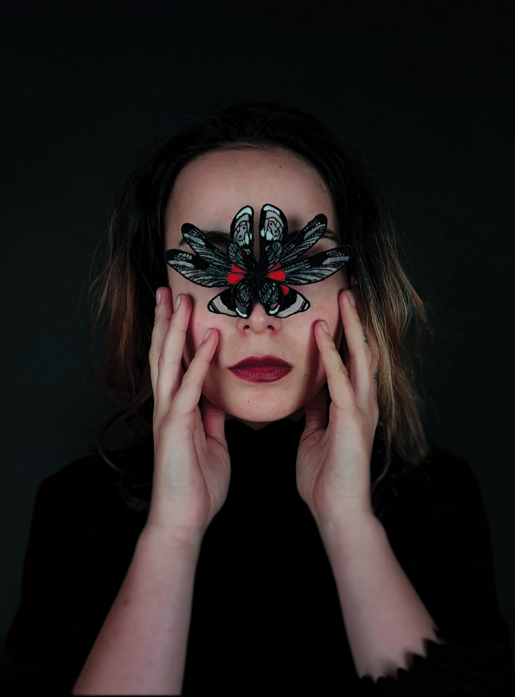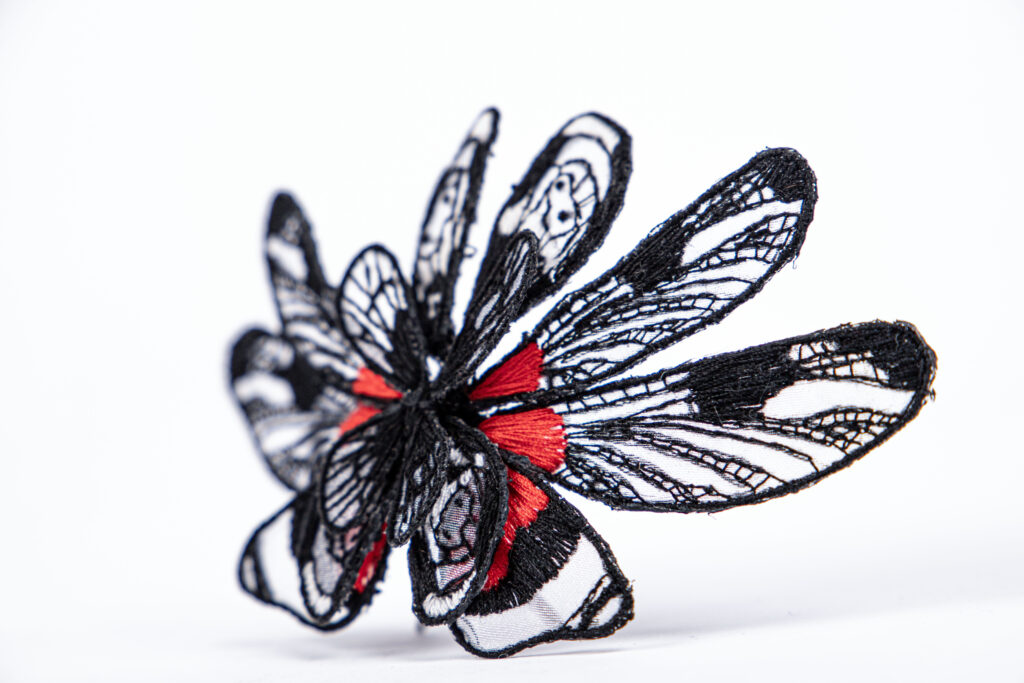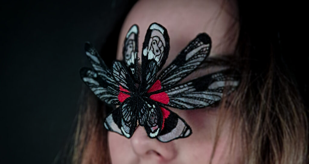 The jewel is made by the technique of embroidery on a translucent fabric. It also uses aluminum wire, which by holding the shape of wings pulls the object from a flat surface into three dimensional space. It is intended to be worn on the bridge of the nose, whilst it covers the wearer’s eyes.
