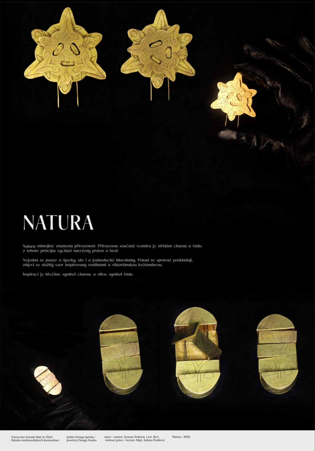 Among other things, natura means naturalness. The alternation of chaos and order is a natural part of the universe, and this principle is the basis for the design of the ring and brooch. These are not just pieces of jewelry, but also simple puzzles. When assembled correctly, a complex pattern inspired by plants and Victorian flower language appears. The inspiration is ivy, which represents chaos, and olive, which symbolizes order.