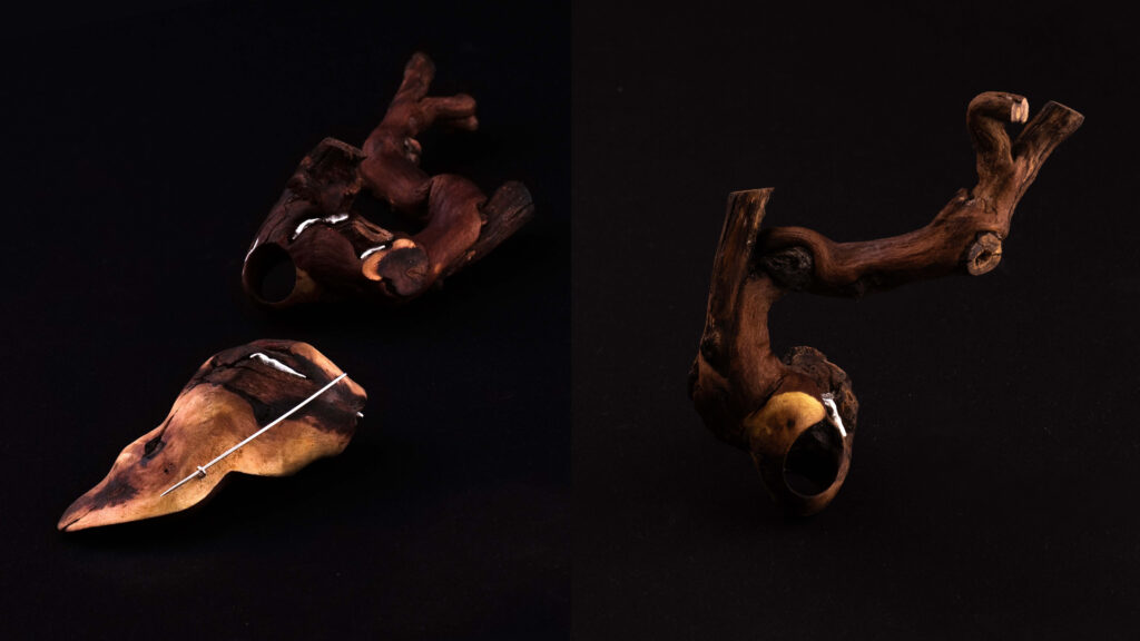 The jewelry set themed Natura consists of a brooch and a ring made from grapevine roots and silver. In my work, I focused on raw natural materials and their authentic structures, which I sought to preserve as much as possible. This approach was also inspired by my interest in the appearance of prehistoric jewelry, which was created primarily from organic sources. Interventions into the material were therefore kept to the minimum necessary to create a functional and wearable piece of jewelry.