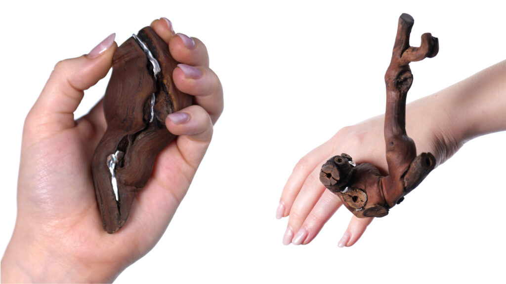 This concept naturally led to the choice of a specific material, with wood playing a dominant role. I was convinced of the particular suitability of grapevine roots by a vineyard owned by my friends, where the roots had no other purpose than being used as firewood. I was thus able to give this material a new life and enhance its value through its combination with silver components.