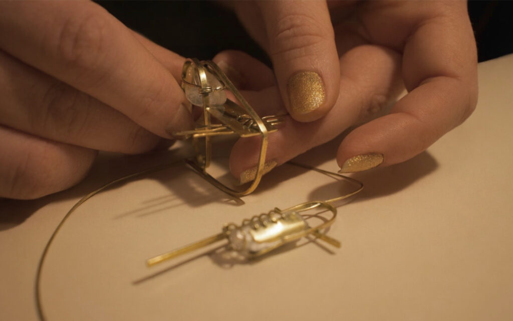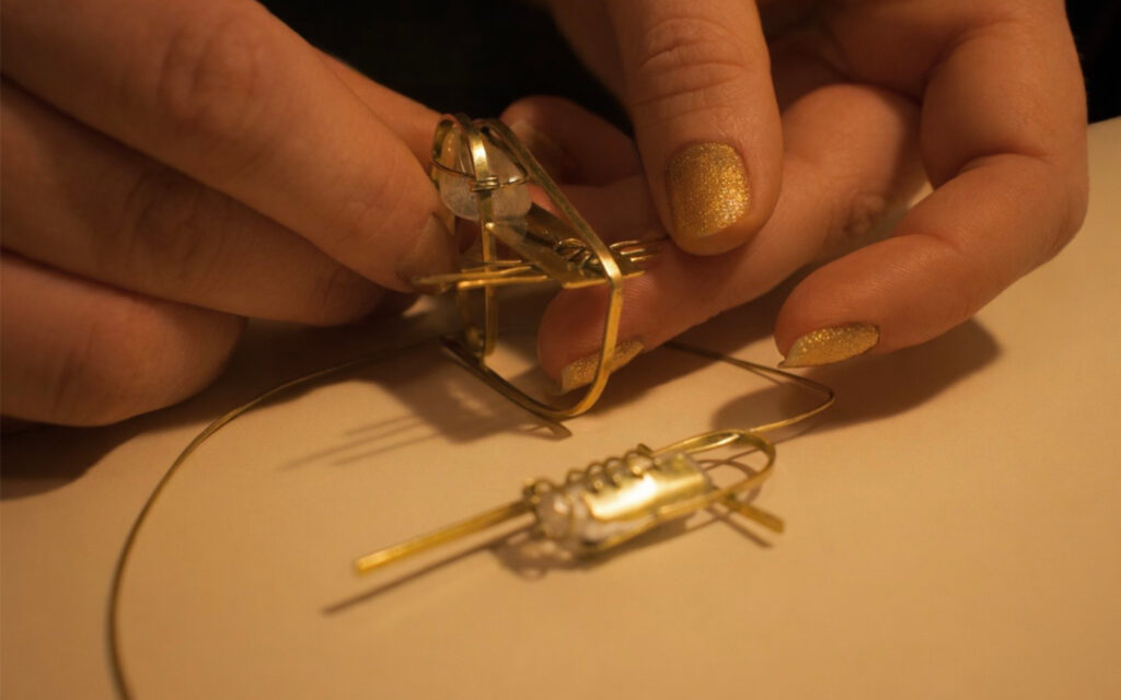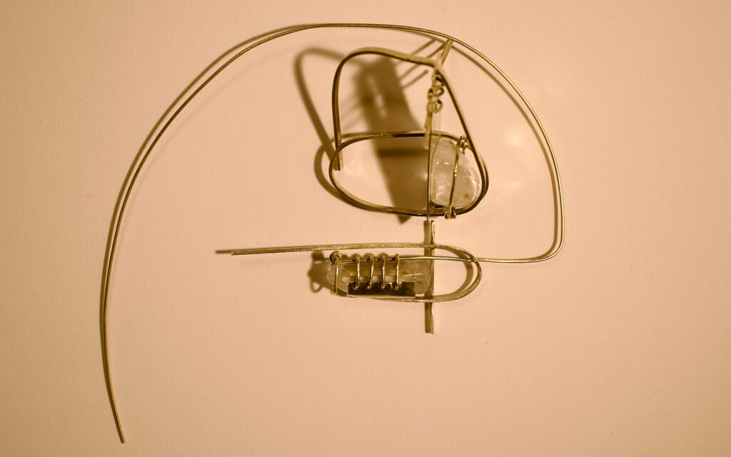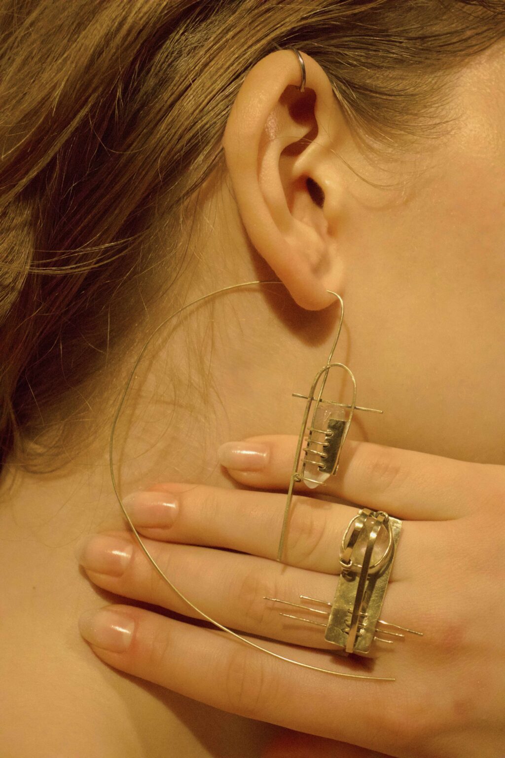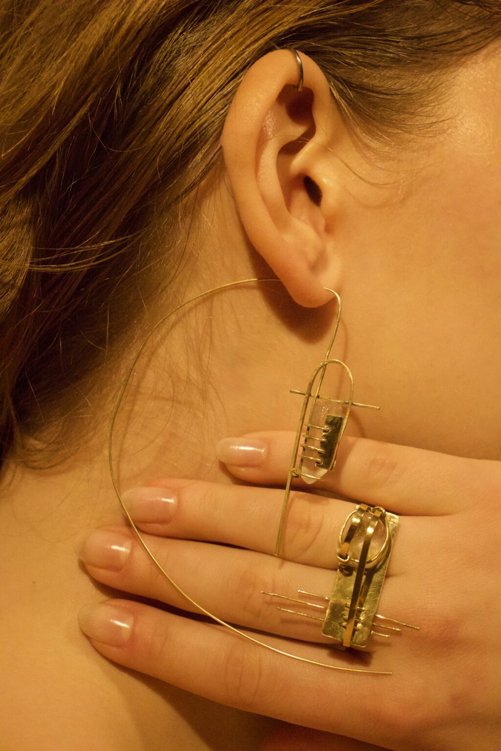 The jewelry collection expresses the mutual relationship between materials and their interaction within space. Brass does not appropriate the crystal, but instead creates space for its existence. The construction therefore does not function as a frame or a boundary, but as a system that enables coexistence within space. The design is shaped by the material, the environment, and the limitations arising from their interaction.
