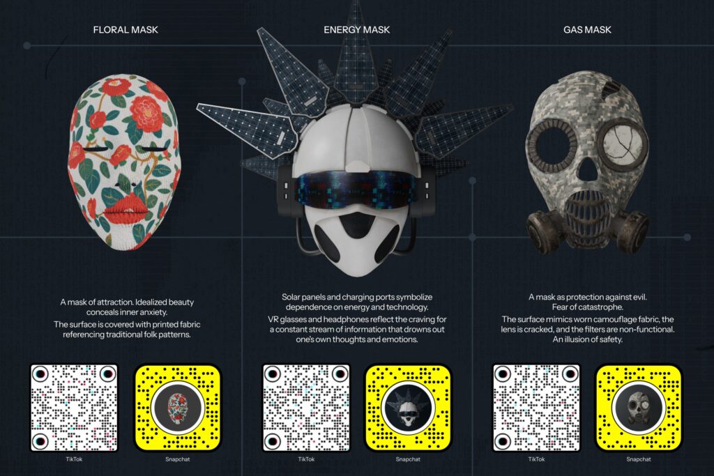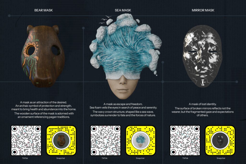 I created a series of AR masks reflecting the fears, desires, and identity of the 21st-century human. The project combines folk traditions, digital design, and the visual culture of social media. The masks were modeled in Blender, textured in Substance Painter, and uploaded to Snapchat and TikTok via Lens Studio and Effect House. Anyone can try them on by scanning a QR code.