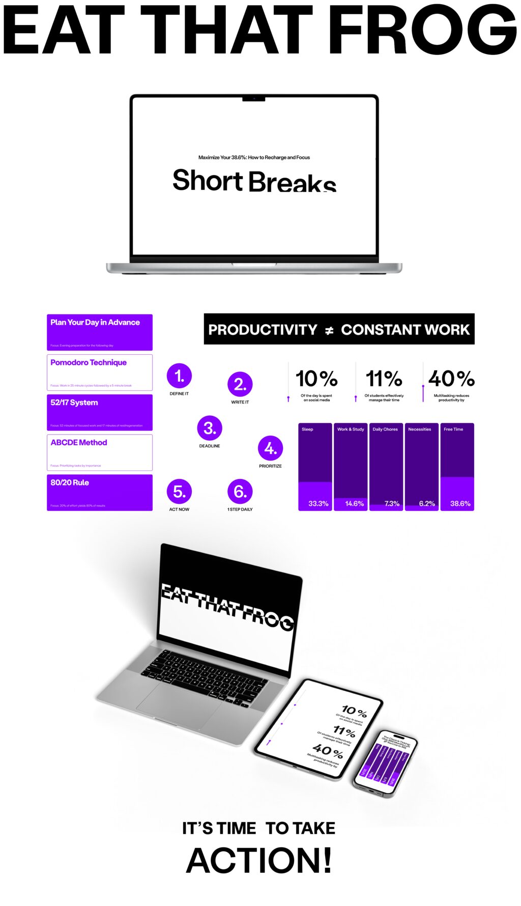 A web-based infographic focused on productivity and effective time management. The project visually presents key productivity principles and techniques, such as identifying the most important task of the day, prioritization, planning, and focused work. The emphasis is on clarity, strong information hierarchy, and intuitive navigation in a digital environment.