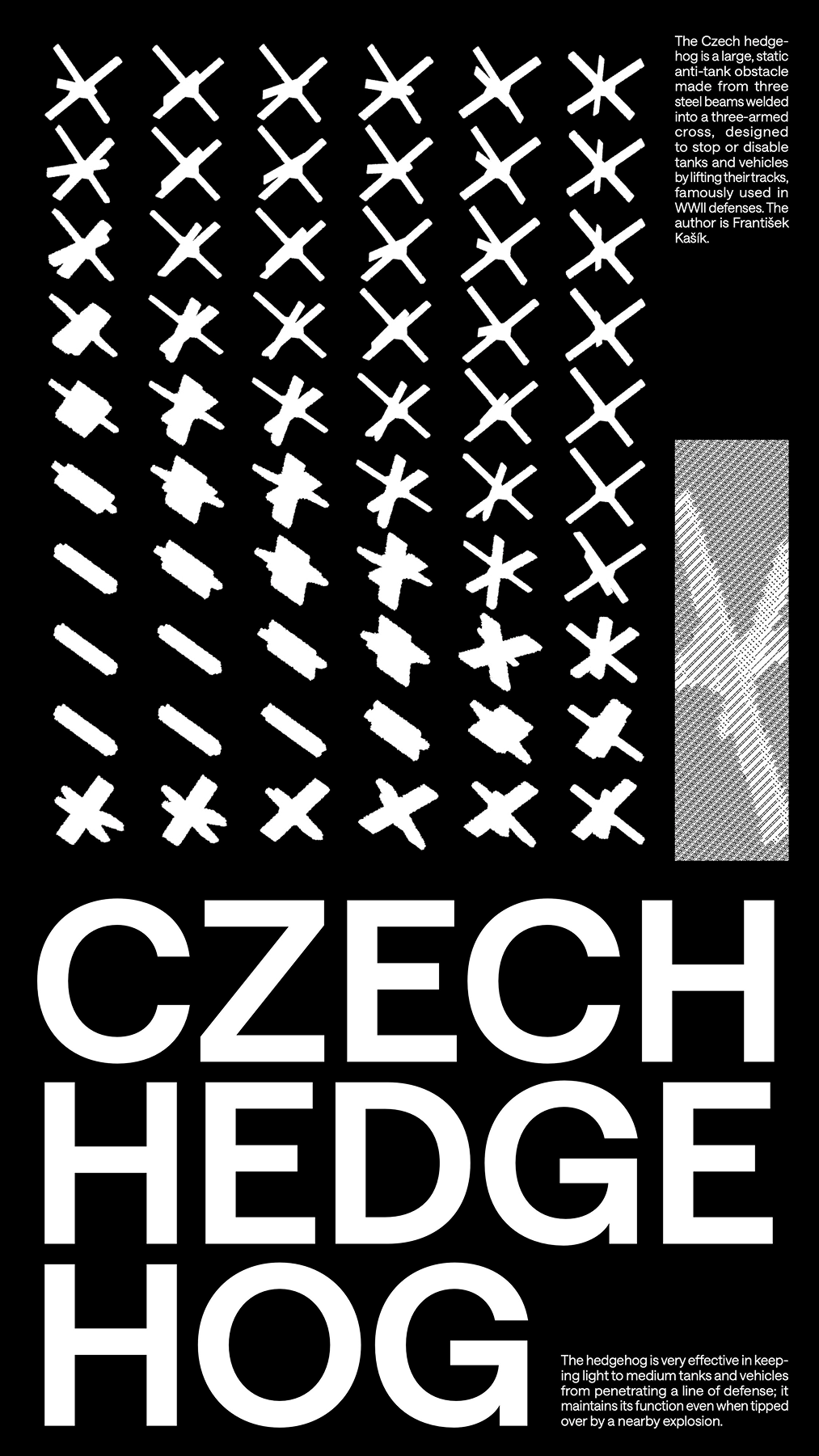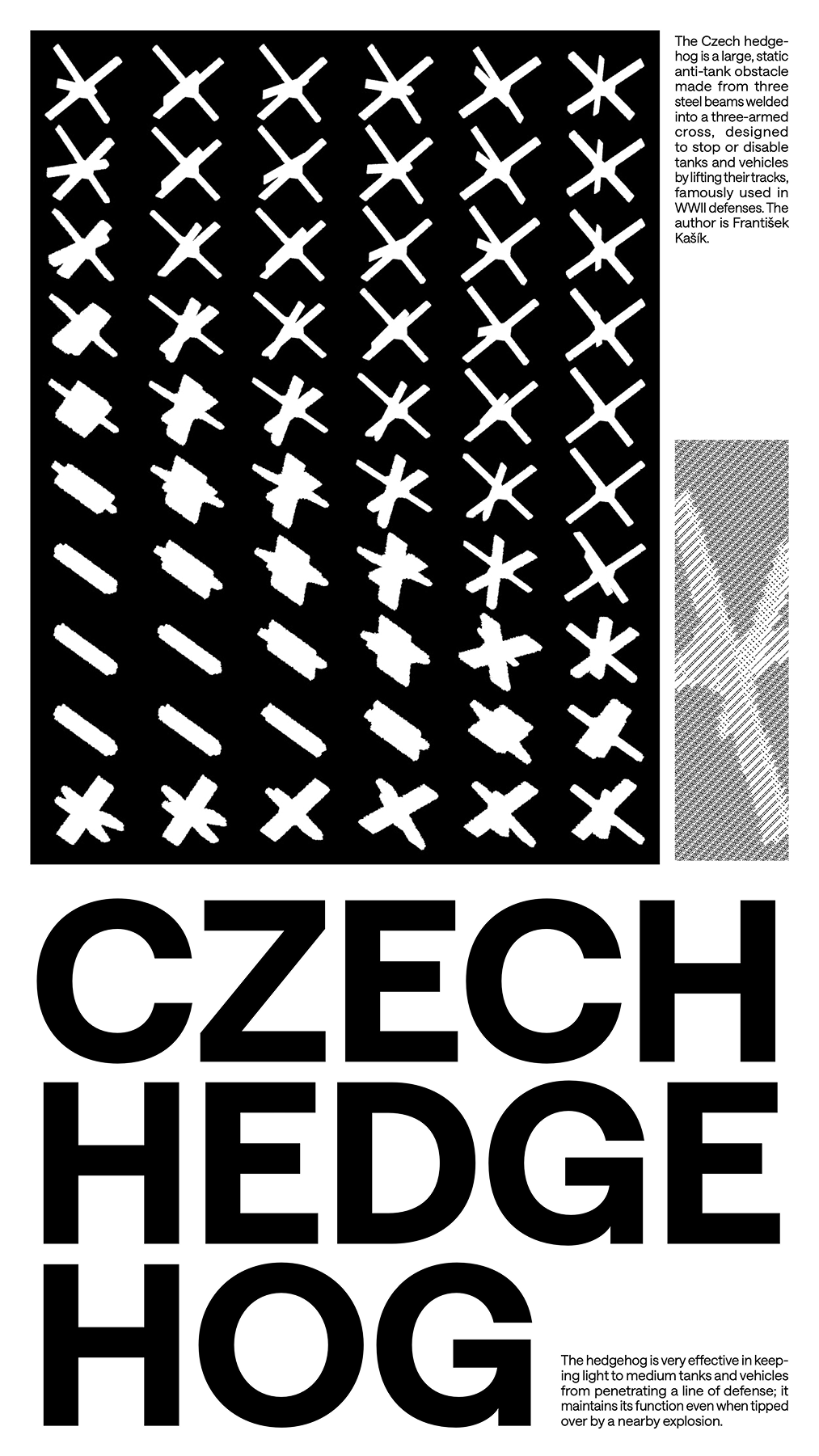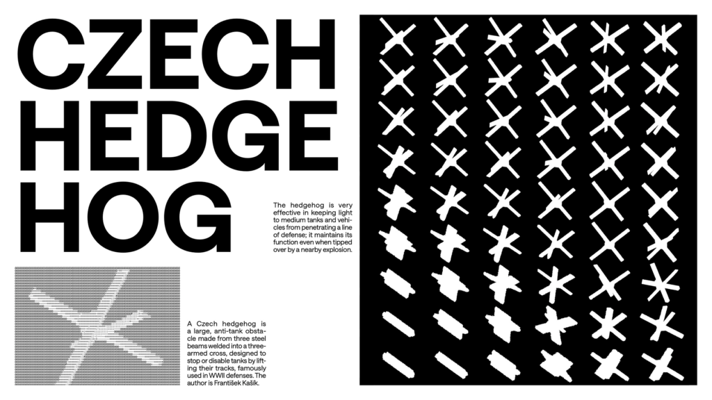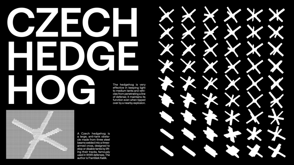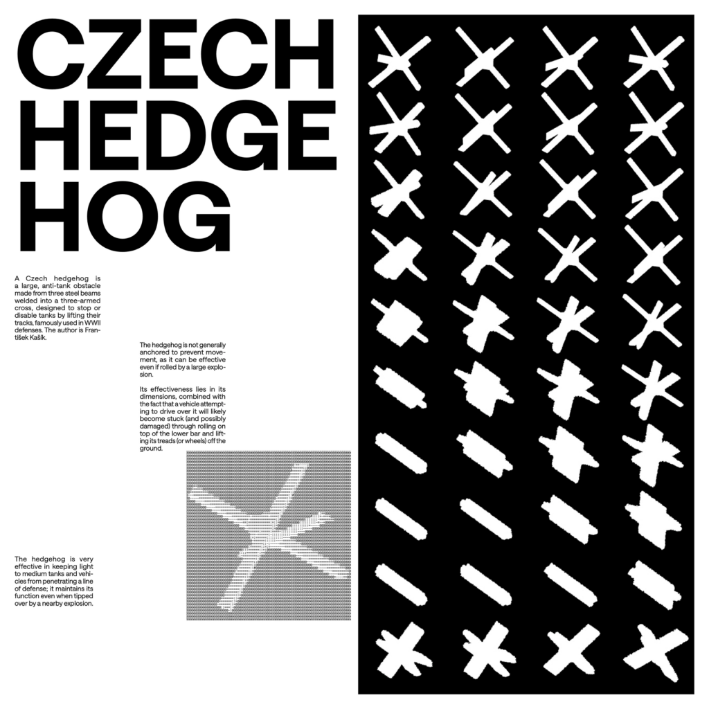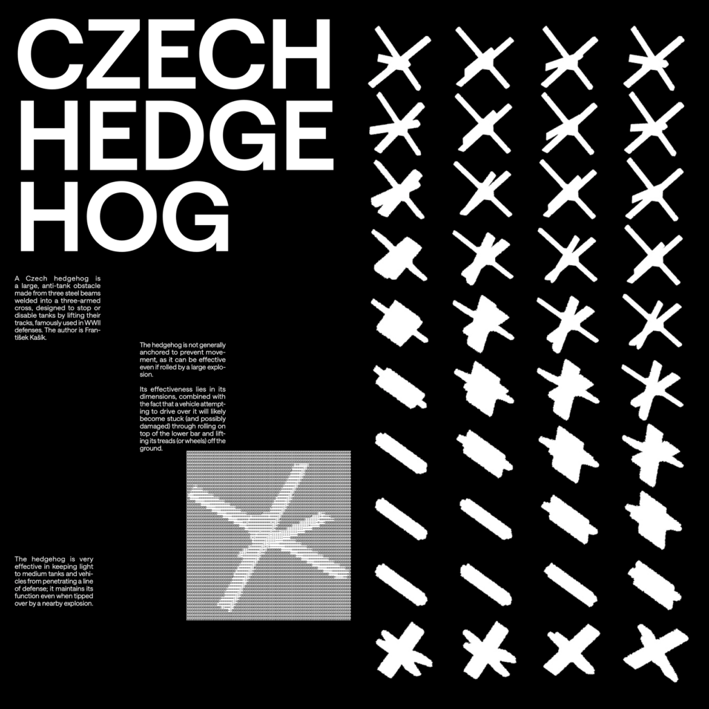 In my work I focus on studying and understanding geometry using previously non-existant technology – digital tools. The subject of my work, the czech hedgehog, was chosen because of rising frustration and fear of the current political situation in Europe and the rest of the world alike. Firstly I deconstructed the hedgehog to its basic planes and then I procedurally put it back together to its complete form. This transformation symbolizes the instability in today’s world and the threat of war.