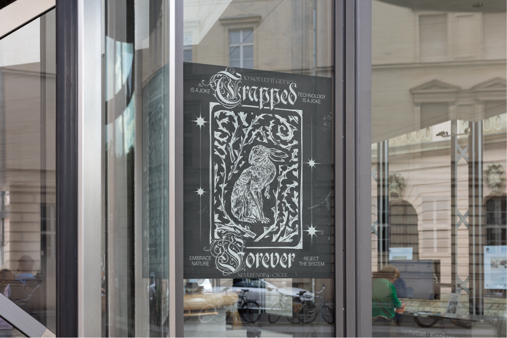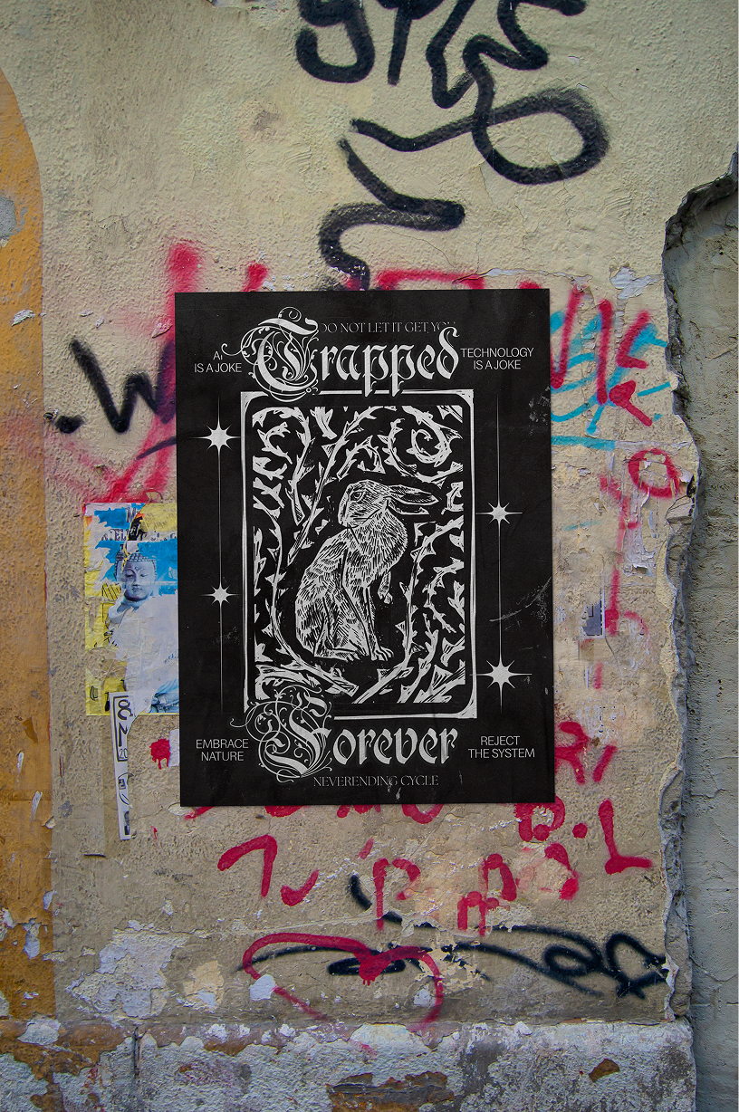 The central motif is a hare, symbolizing both us as a society and innocent nature. It is surrounded by thorns, representing modern technologies that prevent its escape from a never-ending cycle. The illustration is created in the style of linocut, which I consider a return to traditional craftsmanship.