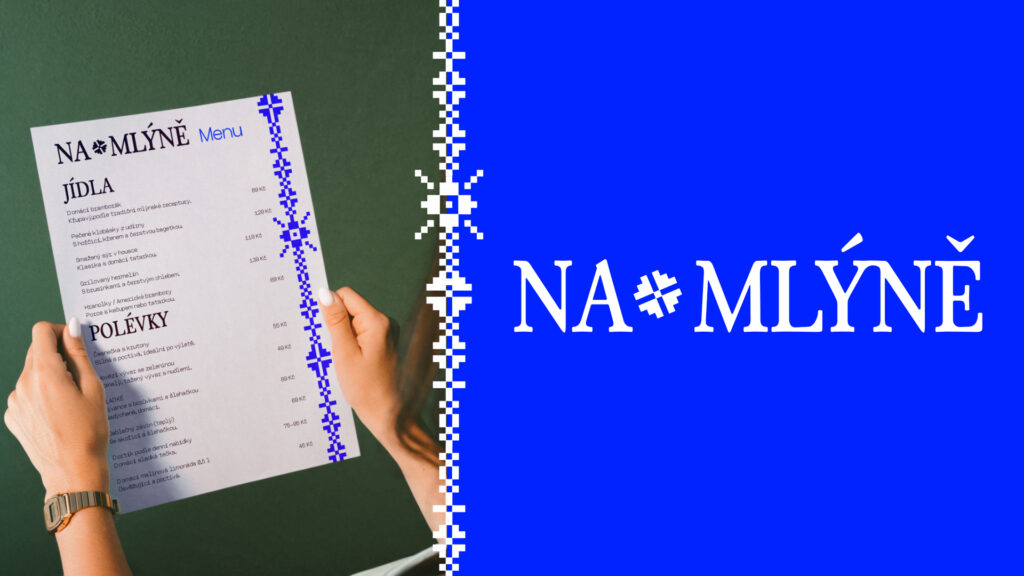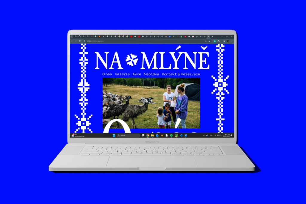 For the farm, bistro, and accommodation Na mlýně, I created a simple scrolling microsite that serves as a digital business card, keeping all essential information in one place. The visual identity is built on regional Wallachian culture. The dominant blue refers to traditional blueprint (modrotisk), while the accompanying graphics modernize folk motifs.Simplified Wallachian embroidery patterns are translated into a geometric grid. I also worked with contrast in typography I chose a classic serif font for headings to evoke tradition, while selecting a clean, modern font for the body text.