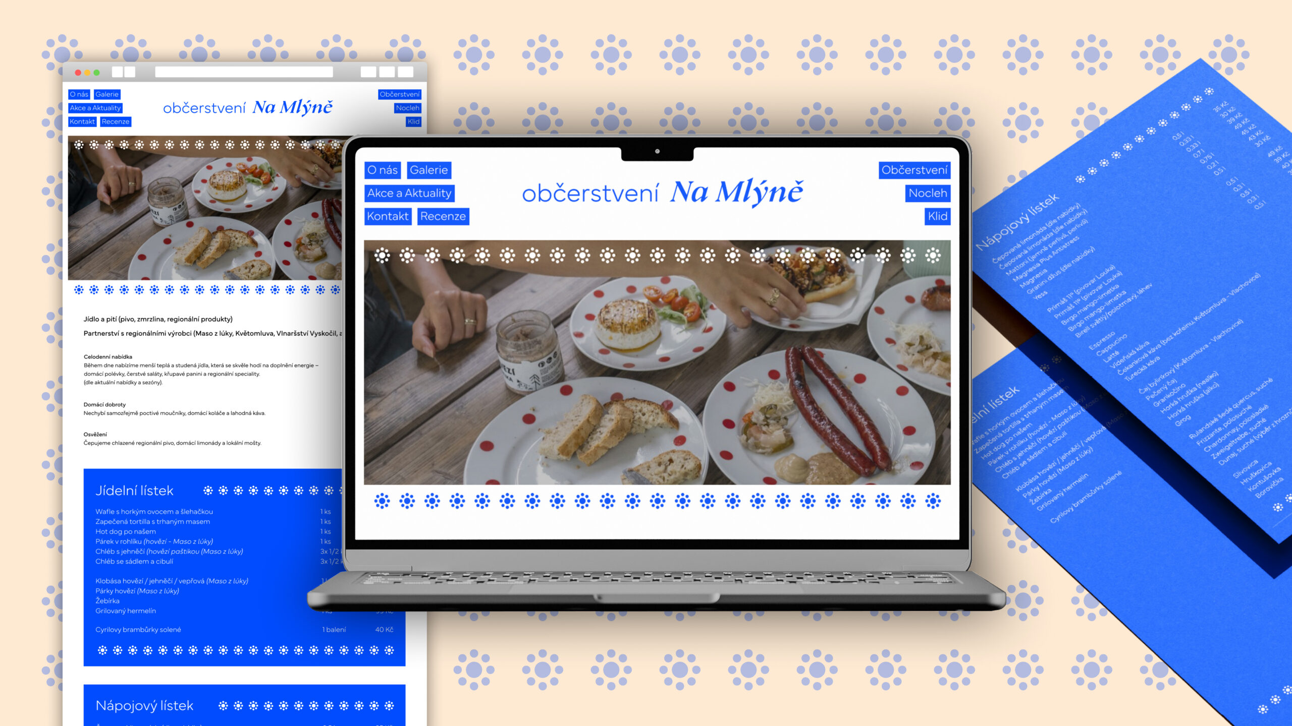 Občerstvení Na Mlýně is a picturesque retreat in the heart of Wallachia. It offers a unique space for outdoor gatherings, family events, and cultural evenings, making it an ideal stop for tourists and peace-seekers alike. For this tranquil spot, I have created a visual identity that blends minimalist graphics with traditional Wallachian rural patterns and colors.