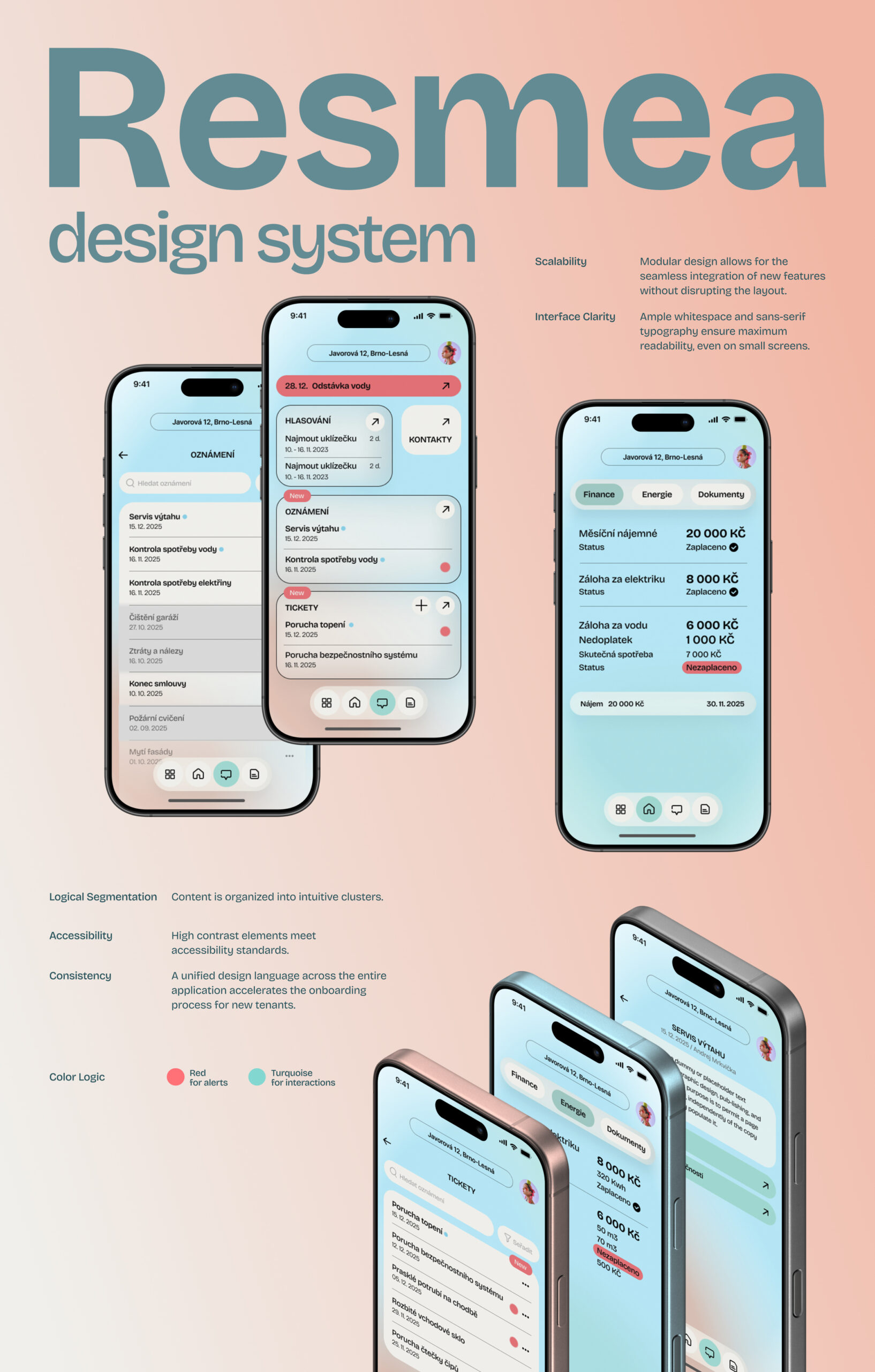 This housing management app concept is optimized for tenant needs. Its UI combines clear visual hierarchy with soft aesthetics, using functional color coding such as turquoise for interactions and red for alerts to guide attention intuitively. Consistent navigation forms the foundation of the UX architecture, giving users constant awareness of their position within the system. Overall, the design removes friction and simplifies everyday home management.