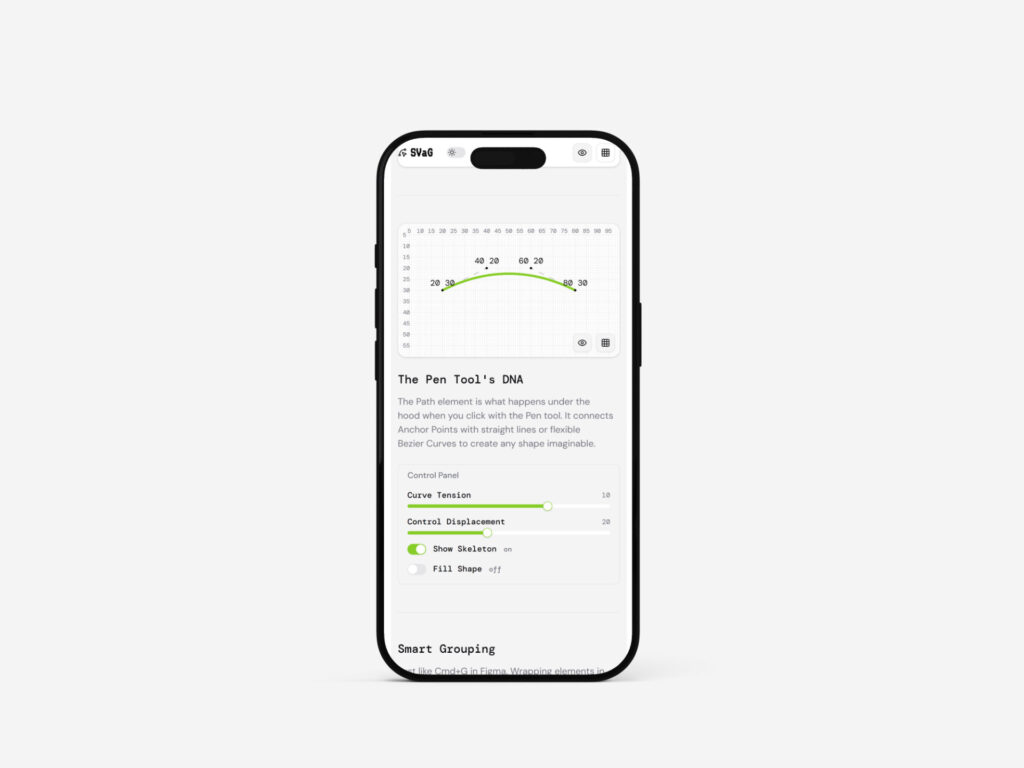 SVaG is an interactive educational platform designed to bridge the gap between technical code and visual design, specifically exploring the capabilities of Scalable Vector Graphics (SVG). The project functions as a “digital laboratory” where designers can manipulate parametric shapes, path interpolation, and advanced filter effects in real-time. By translating abstract code into an intuitive visual control panel, the tool demonstrates how mathematical geometry can be used to create responsive, resolution-independent interfaces and organic motion for modern web design.