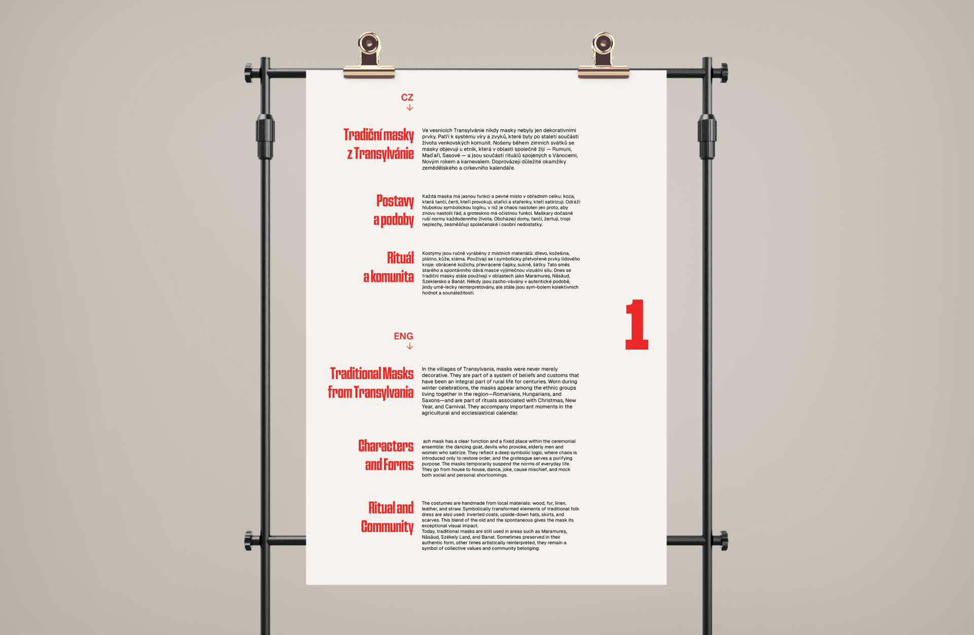 The aim of the project was to create a typographic poster for an exhibition of Romanian masks, as well as an informational panel for the gallery space at the Museum of the Valašsko Region.