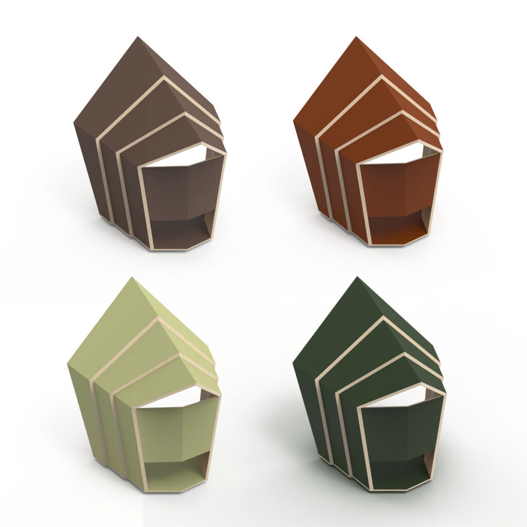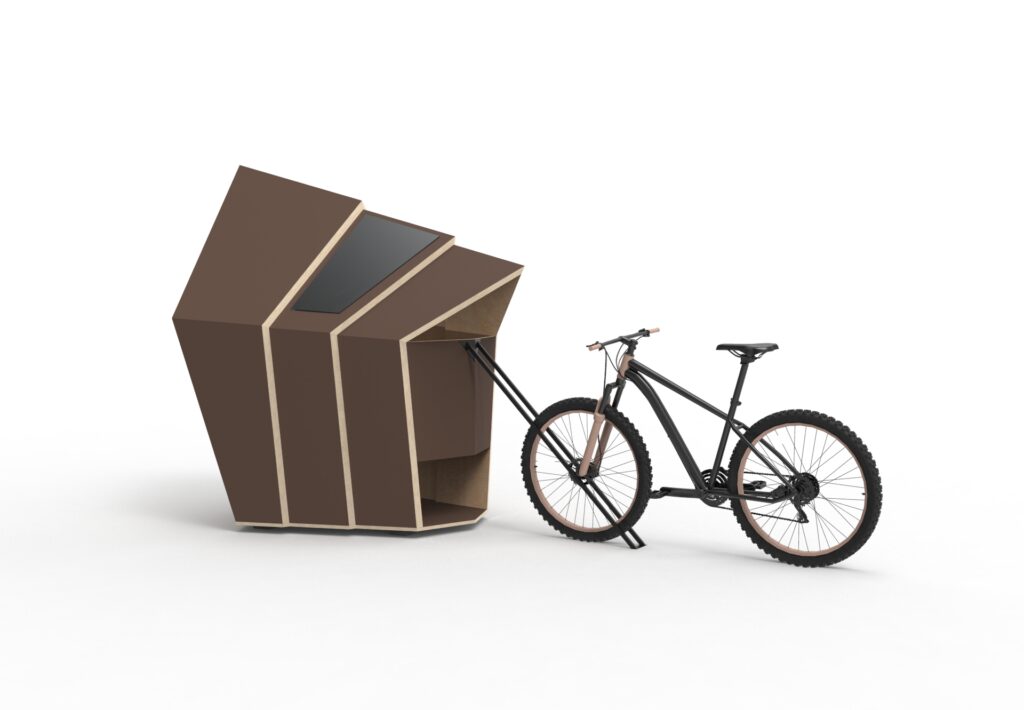 inspired by the layering of feathers and the dynamics of movement, creates an unconventional, memorable appearance. Added value (expansion) is offered by integrated LED lighting, a storage area, an information board, a bicycle stand or photovoltaics – it increases the operational independence of the object.