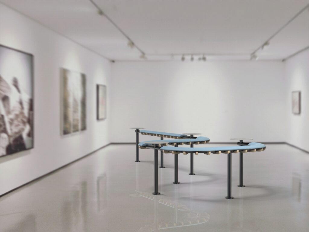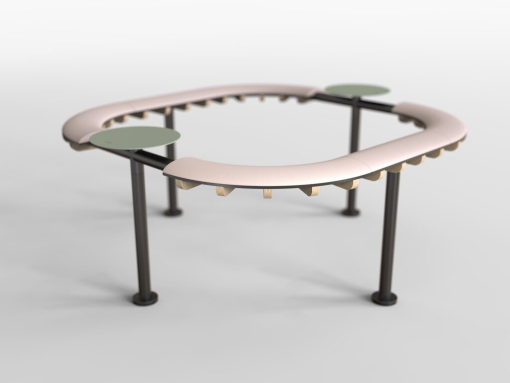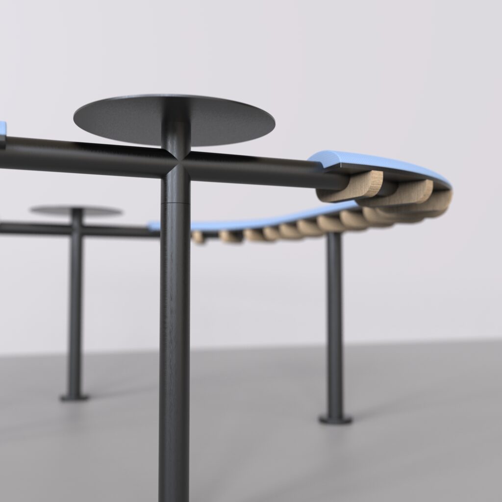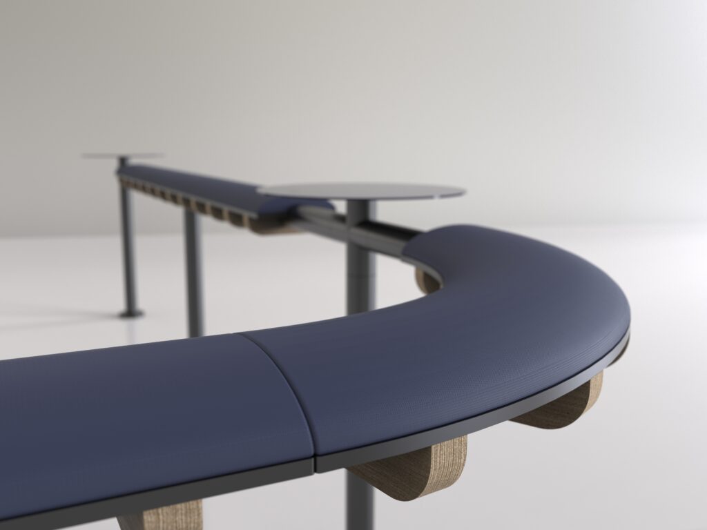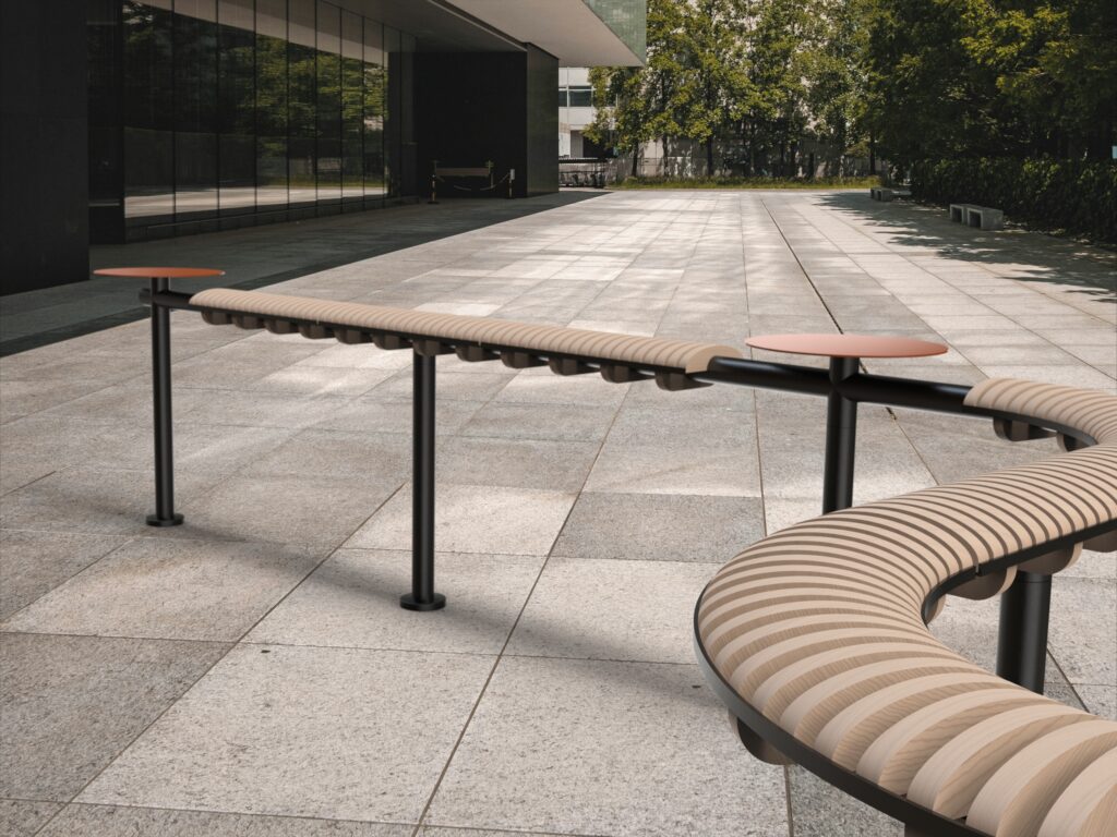 The product presents an alternative to traditional urban furniture in frequented locations where conventional seating capacity is insufficient. In environments with high-intensity movement, it offers a simple solution in the form of a leaning support, designed for brief stops and waiting. The modular system allows for various configurations depending on the specific interior or exterior setting. It is particularly suitable for transport hubs, campuses, and public buildings.