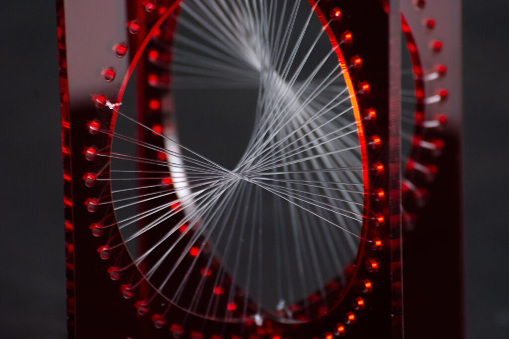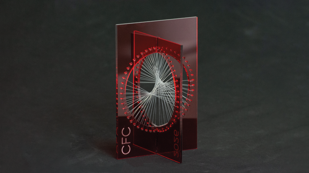 It is based on the intersection of two surfaces, transferring planes into space. The award is spatially intertwined with fishing line, symbolizing the precise drawing that is the basis of all creative work. The red color is based on the ADE color scheme.