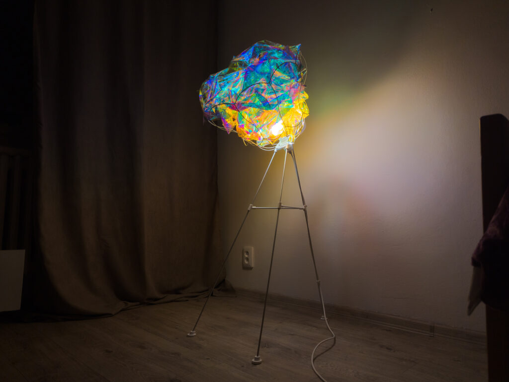 Floor lamp, made by upcycling a non-functional fabric lamp into modern mood lighting.